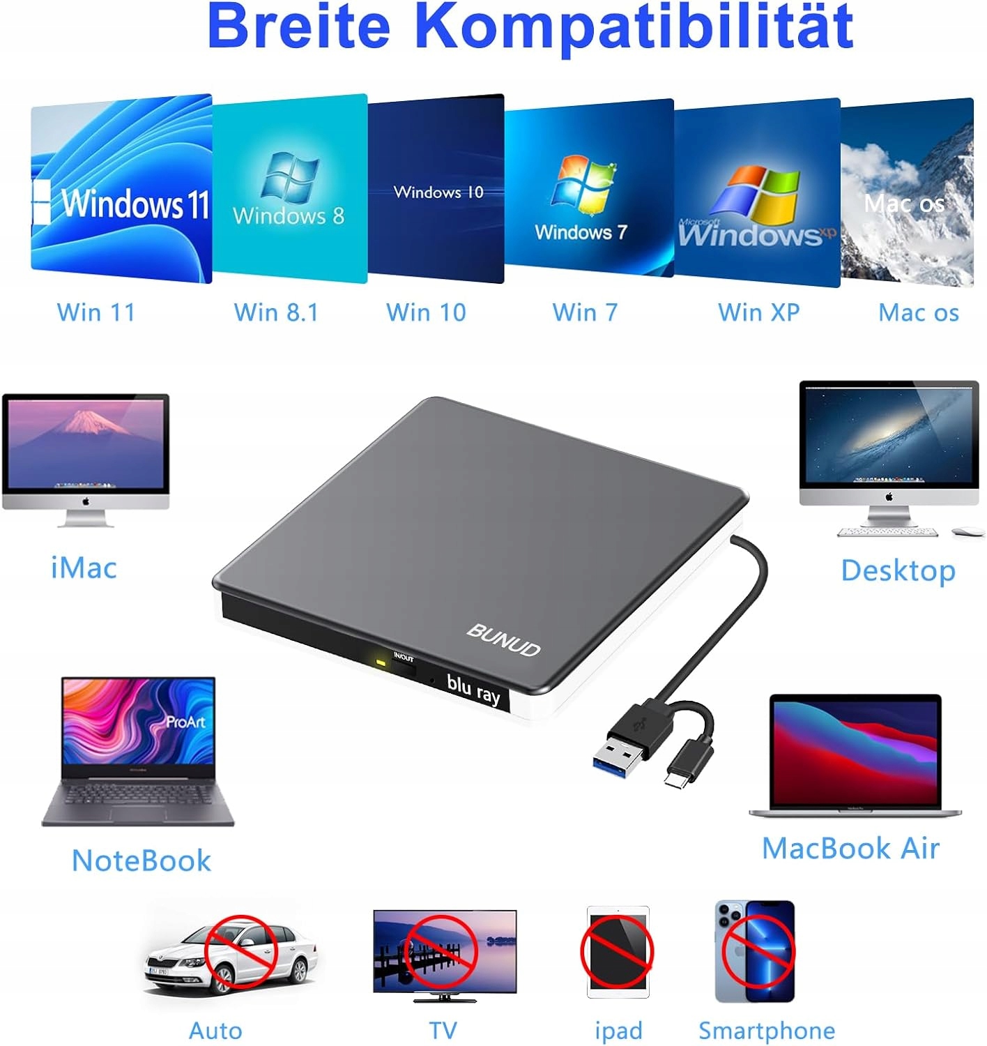 Этот привод Blu-ray совместим с Windows XP/2003/Vista/7/8.1/10/11, Linux, всеми версиями Mac OS, ноутбуками, ноутбуками и настольными компьютерами. Поддержите 3D-плеер и наслаждайтесь четкостью. (Совет: внешний привод Blu-ray не воспроизводит диски 4K Ultra HD)