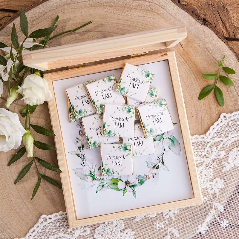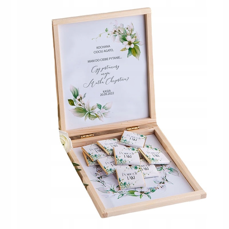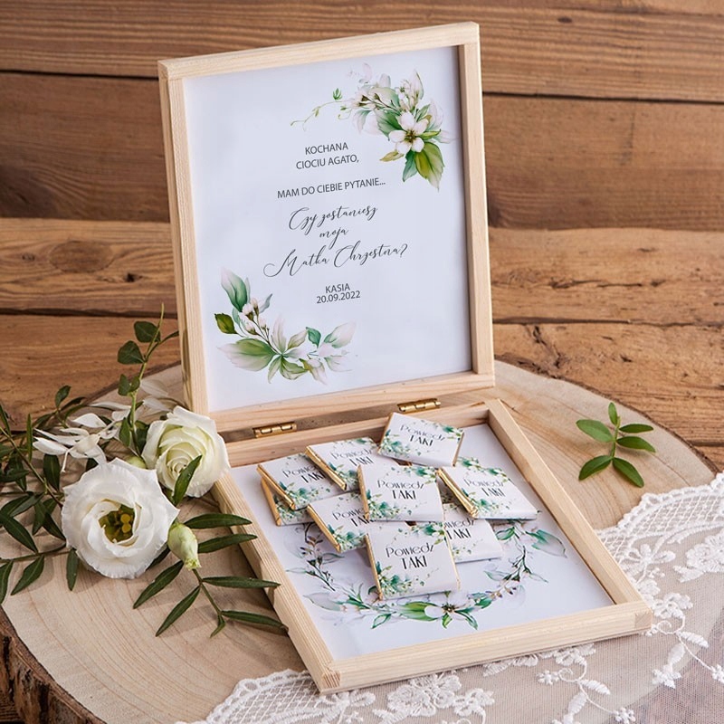 Просьба стать Крестной мамой оформлена в плоской коробке из натурального дерева. Внутри находится карточка с ботанической графикой и вопрос к Крестной. Внутри также вкусные молочные шоколадные конфеты с соответствующим мотивом и надписью: «Скажи ДА». Это прекрасная идея — подарить оригинальную просьбу стать крестной матерью с персонализированным текстом.
