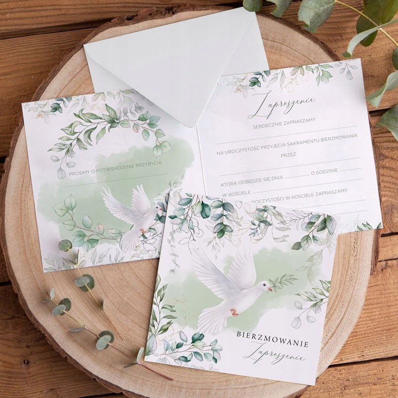 Приглашения на таинство Миропомазания с декоративным изображением белого голубя с мотивом зеленых ветвей эвкалипта. Вы должны самостоятельно заполнить текст внутри открытки, а затем упаковать ее в прилагаемые белые конверты. Шаблон приглашения подойдет как мальчикам, так и девочкам.