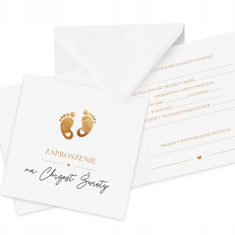 - НАБОР: 10 шт. приглашений на Крещение и 10 шт. одинаковых конвертов; приглашения выполнены в бело-золотом цвете и украшены самым модным изображением золотых ног