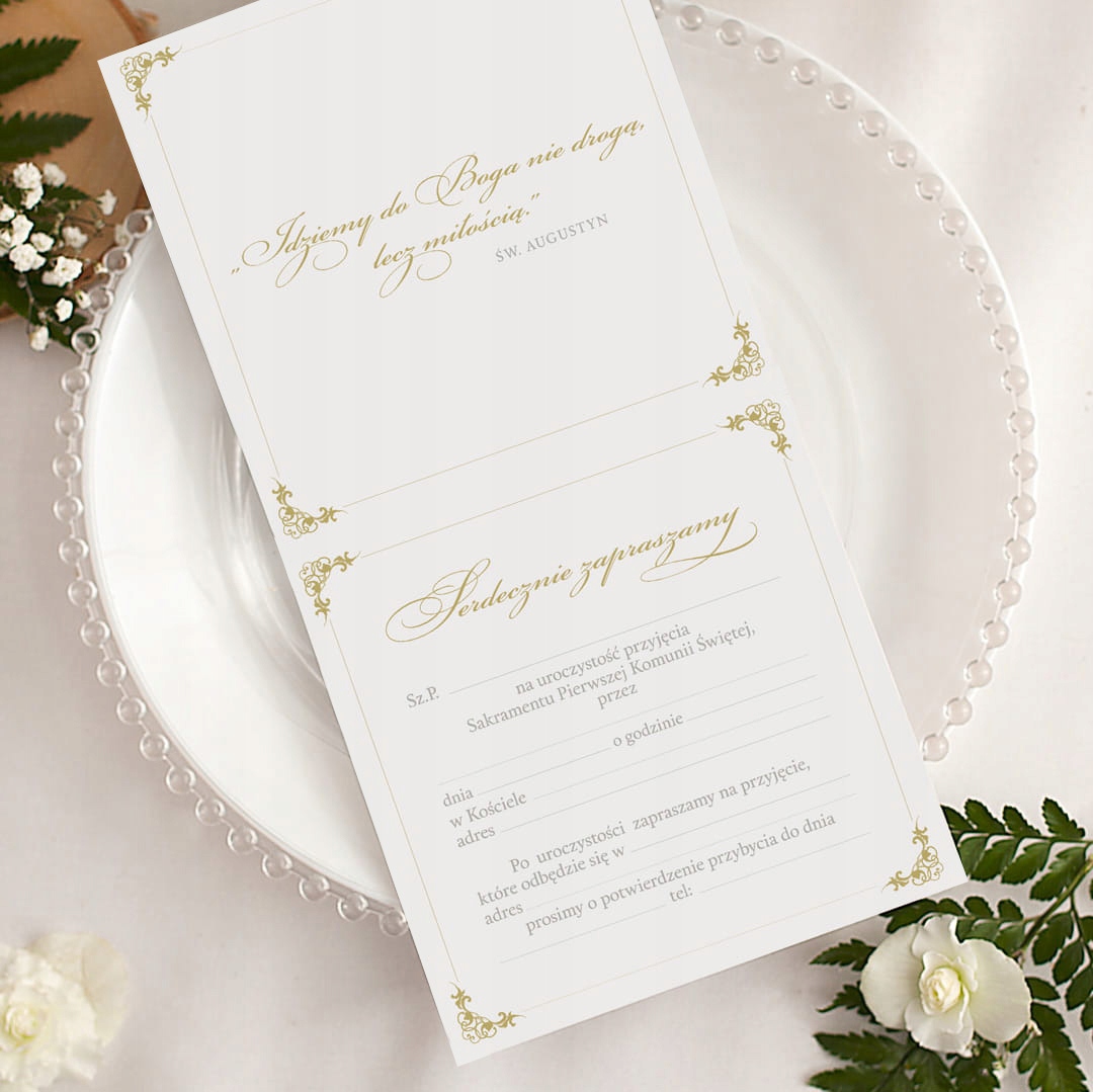 - Элегантное приглашение в Форма карты открылась вверх, украшенную графикой зеленых листьев, соответствующей всей коллекции. Передняя часть приглашения украшена белым крестом на фоне листьев и надписью «Приглашение на церемонию получения таинства святого причастия». Внутри приглашения был установлен текст. P> • 15см x 15 см,