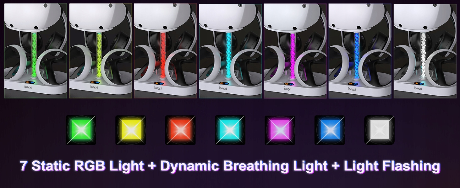 【Обновление 10 режимов освещения RGB с функцией памяти】Светодиодное основание PS5 VR2 имеет прозрачный фонарь с 10 режимами освещения, включая 7 монохромных режимов удержания, динамический дышащий свет и мигающий свет. 7 цветовых последовательностей (статический режим + вспышка): красный, зеленый, синий, желтый, голубой, фиолетовый и белый. Переключите режим освещения с помощью кнопки светодиодной подсветки, нажмите один раз: измените режим освещения, нажмите и удерживайте 3S: выключите и запомните текущий режим освещения, добавьте фантастическое ощущение технологии к зарядной станции PlayStation VR2.