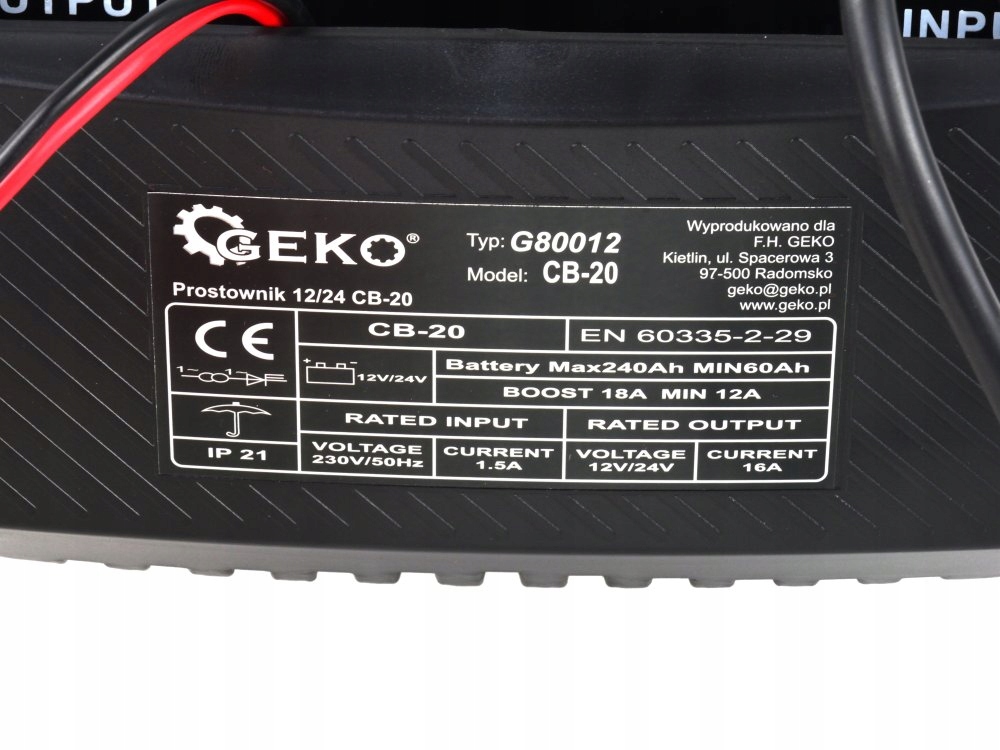 Зарядное устройство известного бренда GEKO, предназначенное для зарядки свинцово-кислотных аккумуляторов напряжением 12 В или 24 В, используемых, в том числе, в легковых автомобилях, мотоциклах, лодках и т.п. Имеет встроенный предохранитель, защищающий устройство от неправильного подключения полярности и короткого замыкания.
