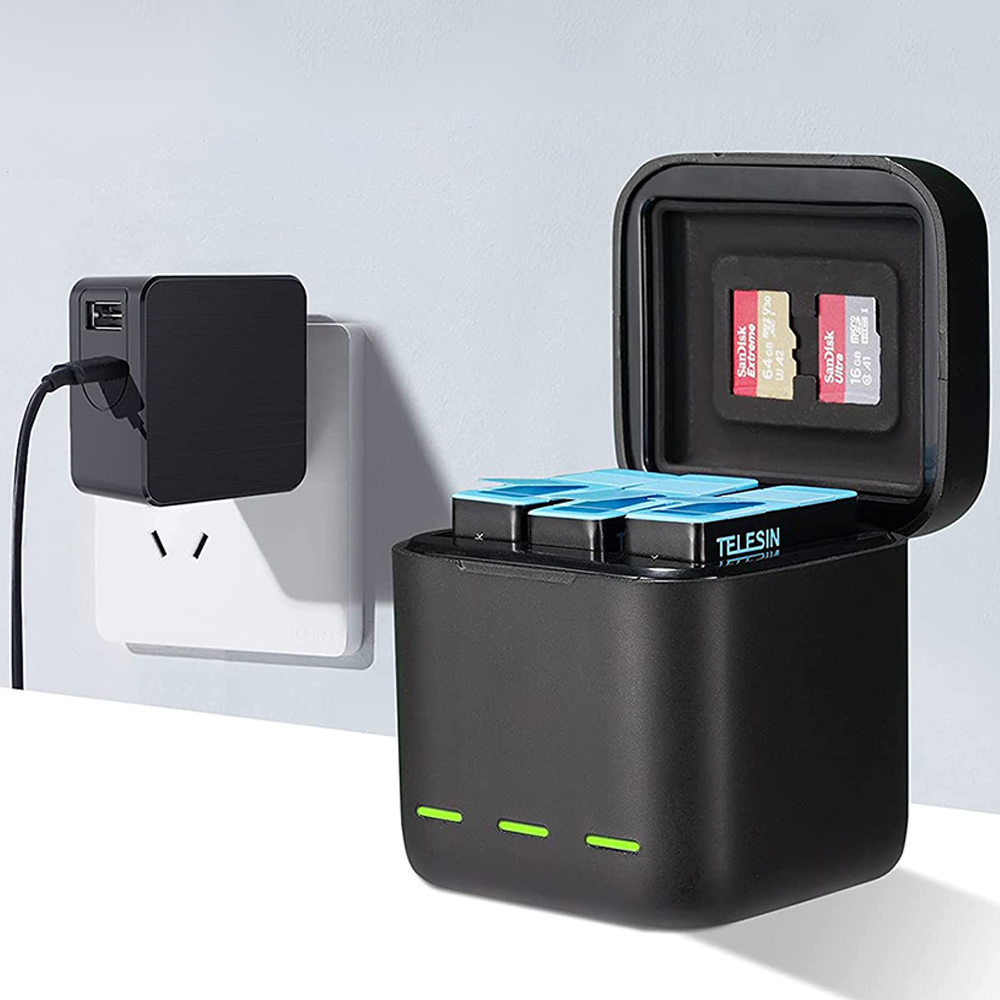 Быстрое зарядное устройство Telesin позволяет заряжать до трех аккумуляторов одновременно. Встроенный Чип сам выбирает подходящие параметры зарядки и продлевает срок службы батареи. Он также оснащен светодиодами, указывающими состояние зарядки.