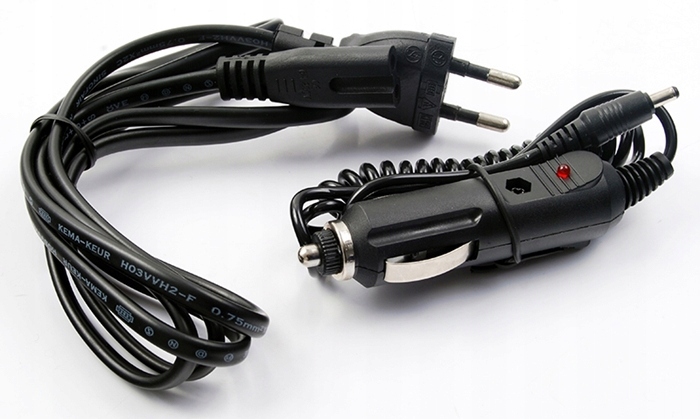 В комплект входят 2 кабеля: сетевой кабель 230 В (длина около 1,5 м) и 12 В (для зарядки в автомобиле — длина около 1 м).