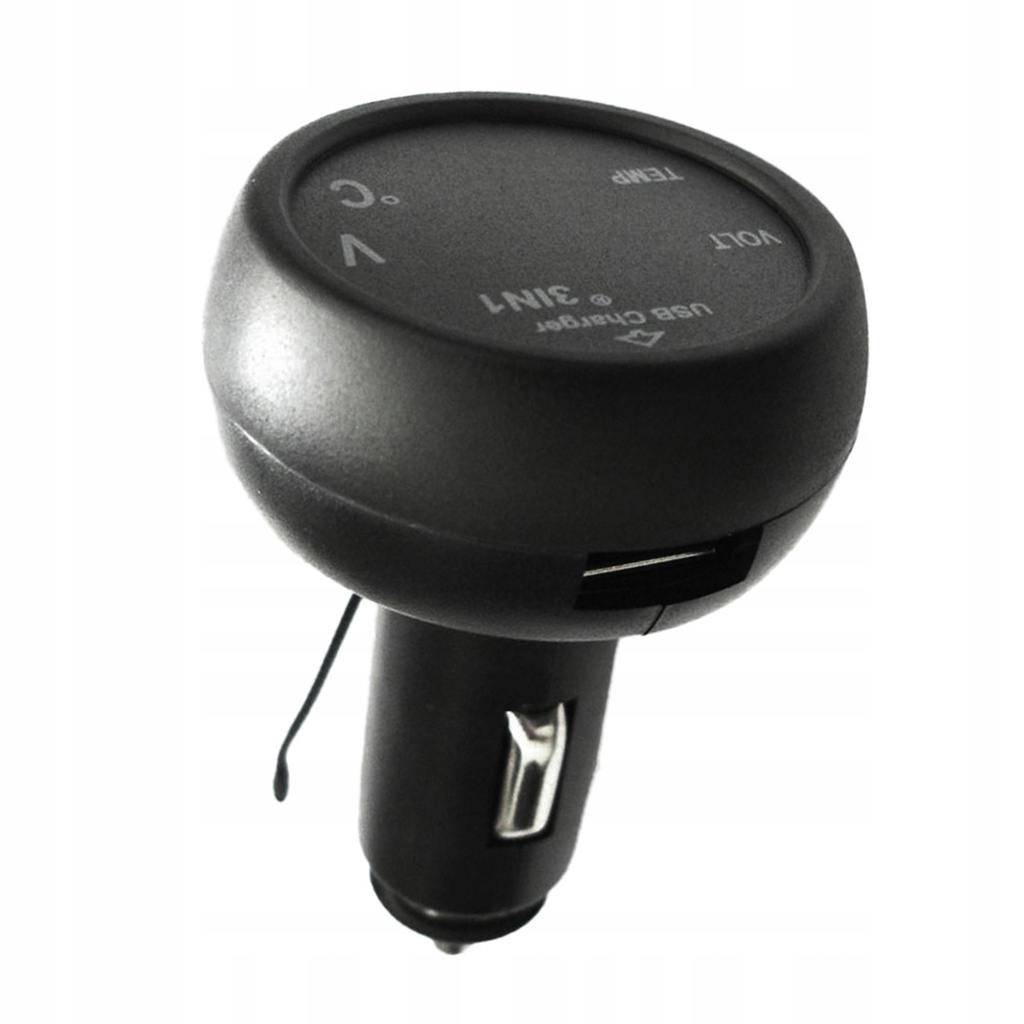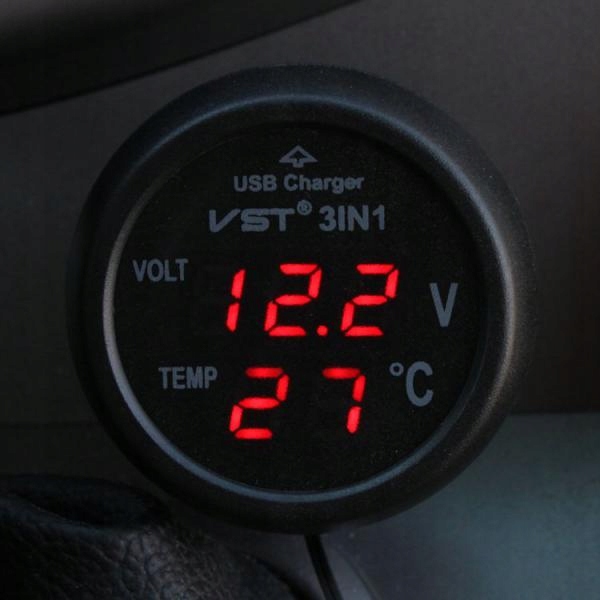 : Дисплей: Светодиодный Цифровой: красный – температура; Красный - напряжение Входное напряжение: 12/24 В Выходное напряжение USB: 5 В, 2,1 А Гнездо прикуривателя, подключи и работай. Диапазон измерения: Напряжение: 0–30 В Температура: -10 ~ 80 ° C Выход USB, можно заряжать любой мобильный телефон, Планшет Материал: пластик черного цвета. Размер: примерно 46 * 46 * 80 мм. В комплект входит: 1 автомобильный вольтметр 3 в 1 с цифровым вольтметром $ USB-зарядное устройство