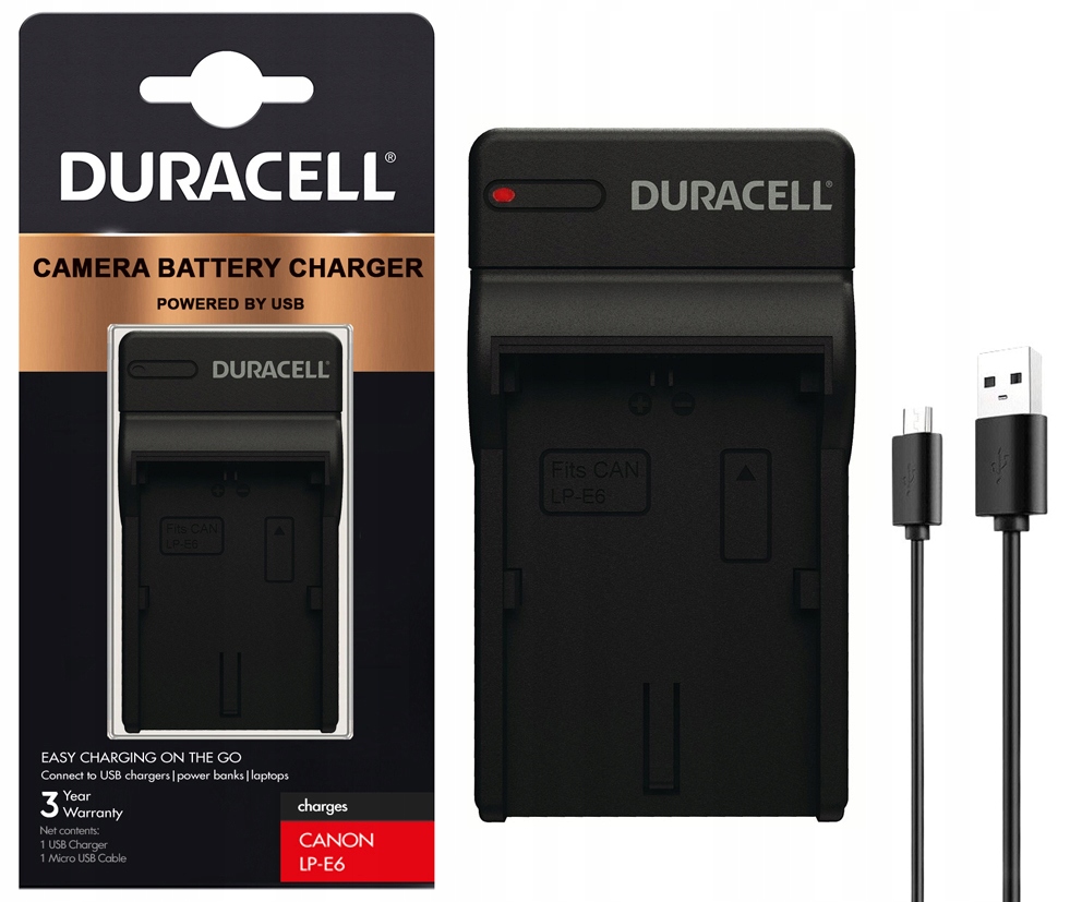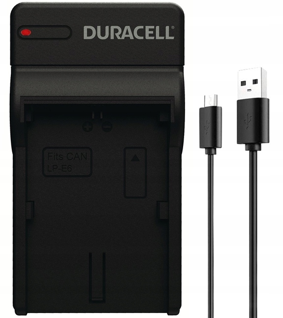Зарядное устройство DRC5903 от Duracell с питанием через USB-кабель. Работает со сменными и оригинальными батареями LP-E6. Зарядное устройство поставляется с кабелем USB-A/microUSB. Производитель оснастил его диодом, который может светиться красным или зеленым светом. Благодаря этому аксессуару он легко информирует о состоянии зарядки аккумулятора.