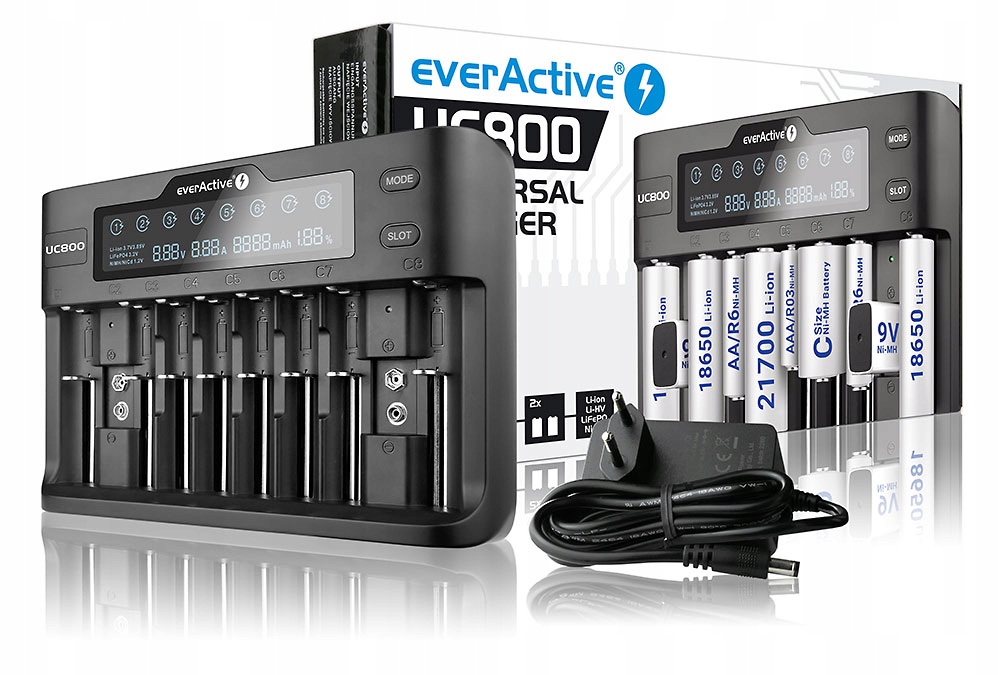 зарядное устройство UC800, сфокусированное на максимальной совместимости - мы заряжаем любые батареи Ni -MH в размерах: R6 AA, R03 AAA, R14 C, SC и 9 В батареи. Кроме того, UC800 также поддерживает литий-ионные батареи с напряжением 3,6/3,7 В, их высоковольтным альтернативным Li-HV, номинальное напряжение-3,85 В и батареи Li-Fepo4. В случае батарей на основе литров зарядное устройство будет обрабатывать такие размеры, как: 10440, 14500, 14650, 17500, 17670, 18350, 18500, 18650, 20700, 21700- также обеспечен, 22650, 25500, 26500, 26650, 16340 R-CR123E. Максимальный диапазон SLED до 76 мм , это обеспечит возможность заряжать все более популярную батареи 20700 и 21700 в версии с помощью электронной защиты