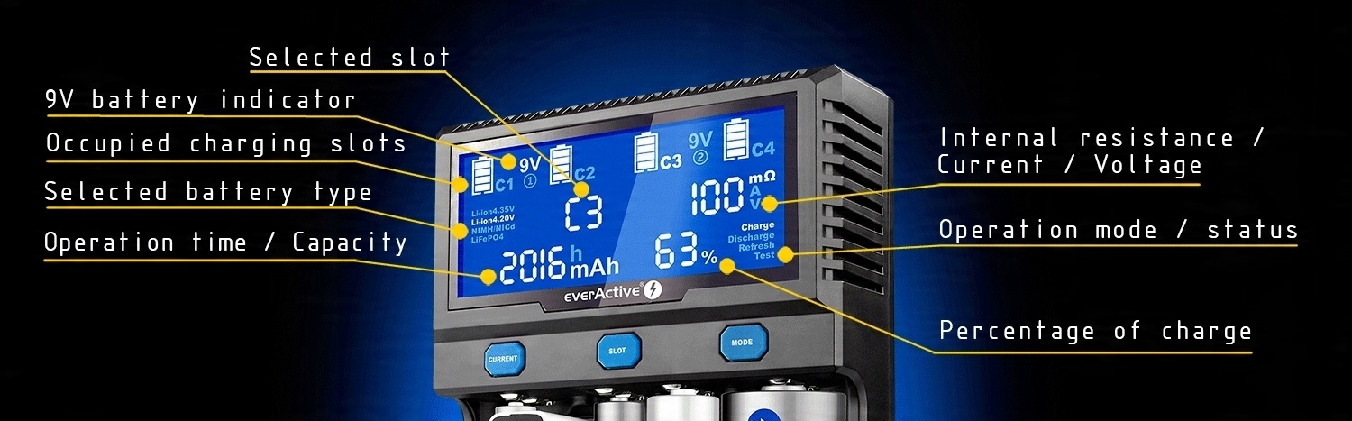 <ул>Широкая совместимость — не единственное преимущество этого зарядного устройства. Большой, легко читаемый дисплей с подсветкой, постоянно отображает все самые важные значения: