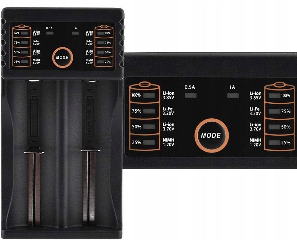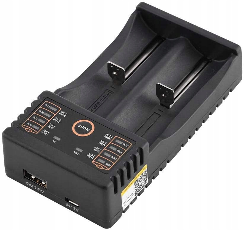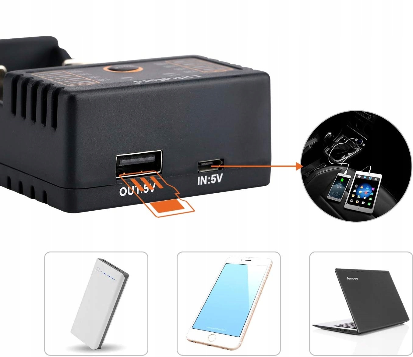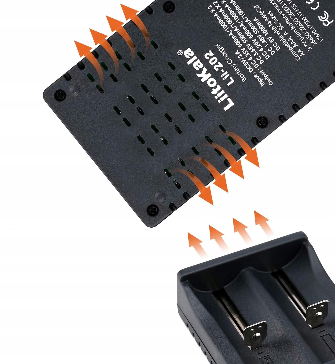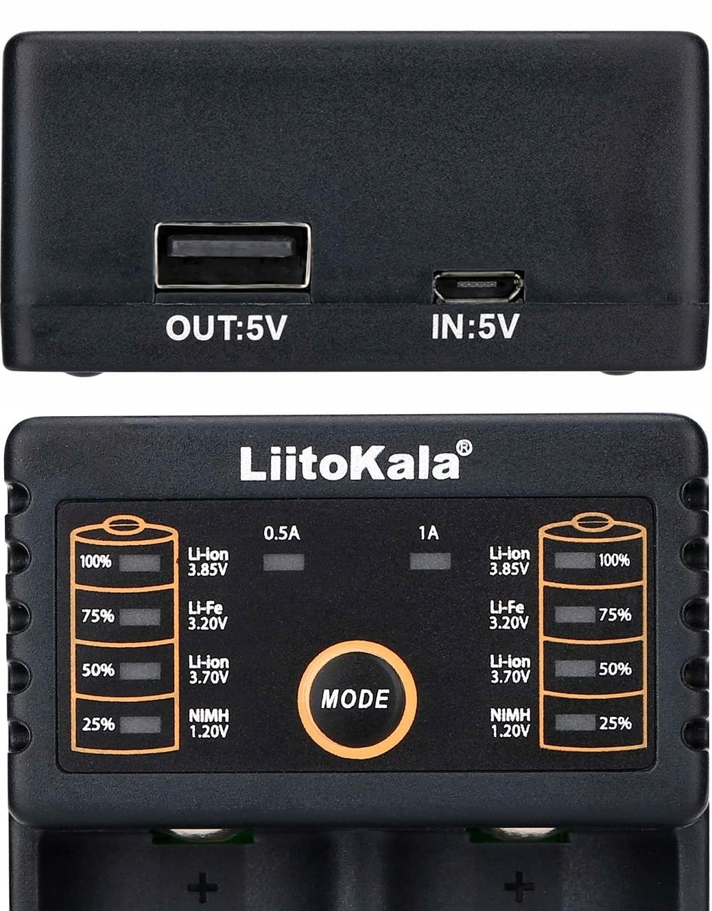 Lii-202 имеет входной порт постоянного тока 5 В/2 А и общий выходной порт USB 5 В. Благодаря общему USB-выходу зарядное устройство может работать как powerbank с любыми установленными в зарядное устройство аккумуляторами.