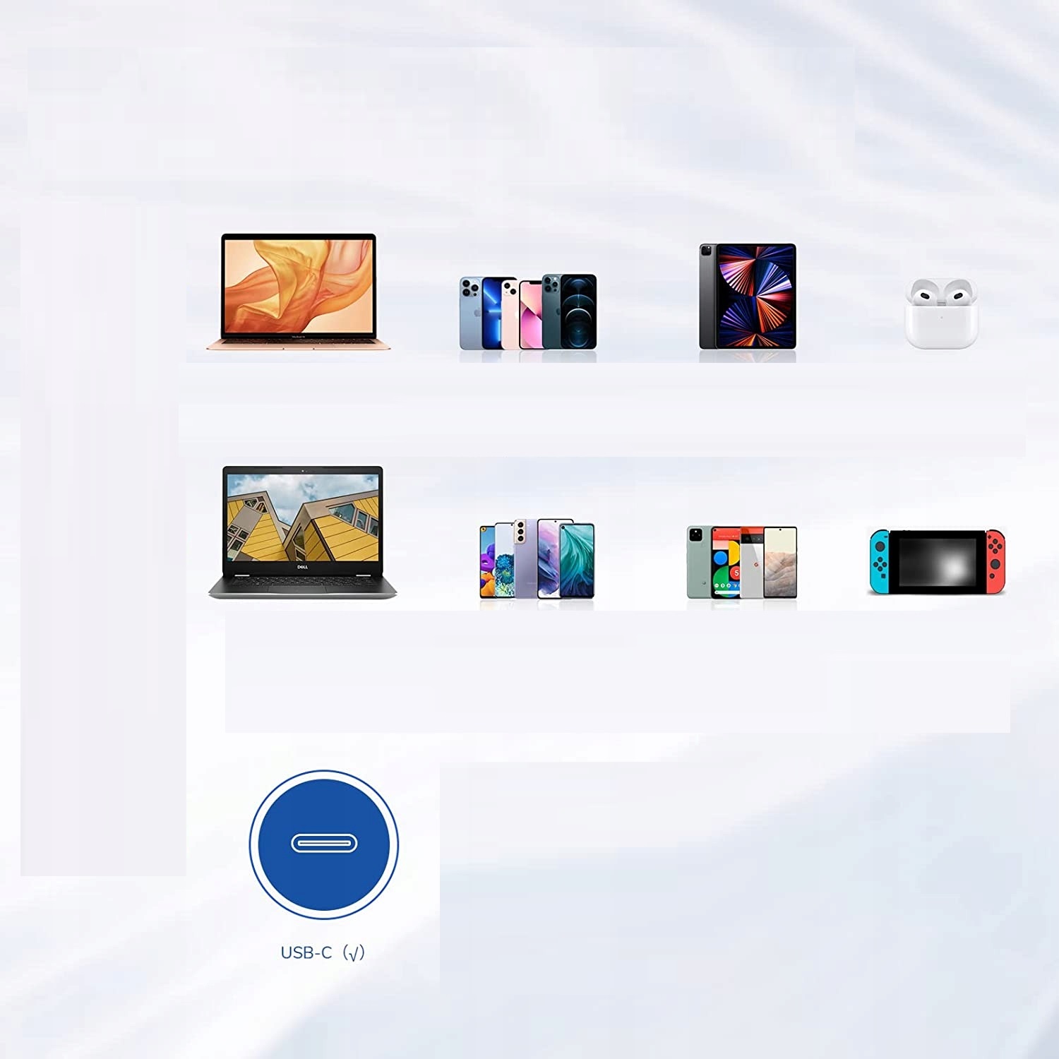 - Универсальная совместимость: Этот USB-. Зарядное устройство C совместимо с MacBook Pro 13/14/15/16 дюймов, MacBook Air 13 дюймов, iPad Pro, iPhone 13 AirPods Pro, HP Spectre, HUAWEI MateBook, Galaxy S22, ноутбуками, MagSafe, Google Pixel Dell XPS, ThinkPad, Swtich, планшеты, Power Bank и другие устройства USB C.
