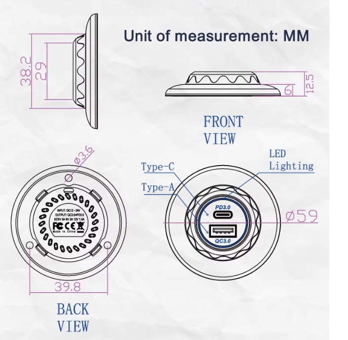 USB-зарядное устройство PD3.0 QC3.0 Крепление 12В 24В Светодиод Белый Круглый 48Вт