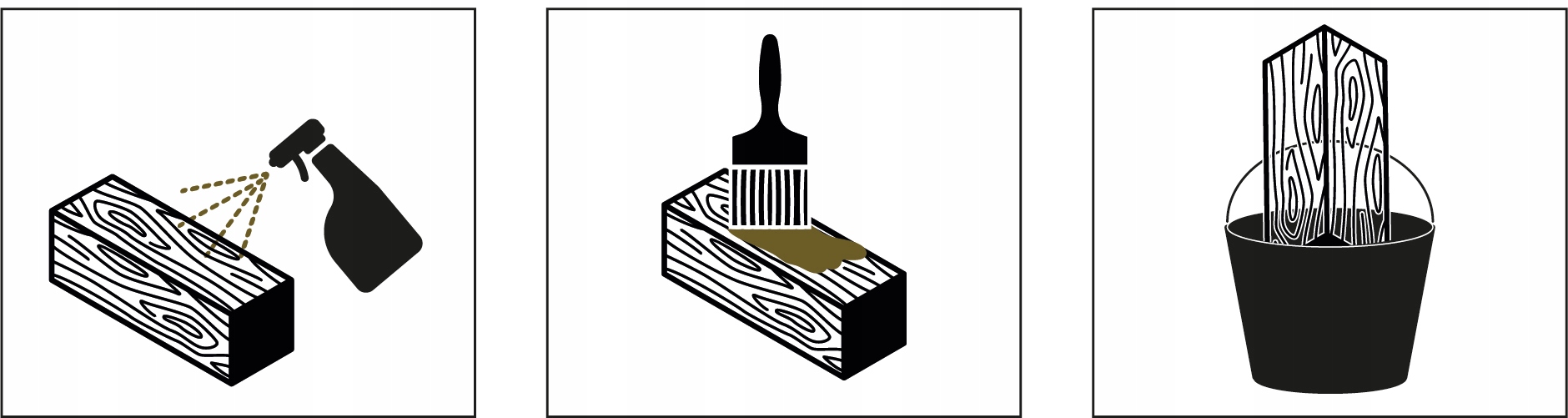 Используйте продукт в количестве, соответствующем способу применения и предполагаемому эффекту. Наносить на древесину не менее чем на две покраски кистью или распылением, с интервалом не менее 2 часов, путем промывки всех элементов погружением.