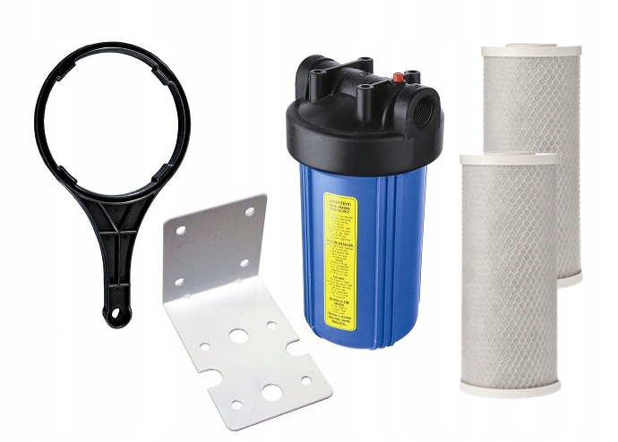 - большой, эффективный угольный фильтр большого синего цвета диаметром 10 дюймов в комплекте с двумя угольными картриджами, ключом для откручивания корпуса и сборкой стопа – осветляет воду, улучшает ее вкус и аромат
