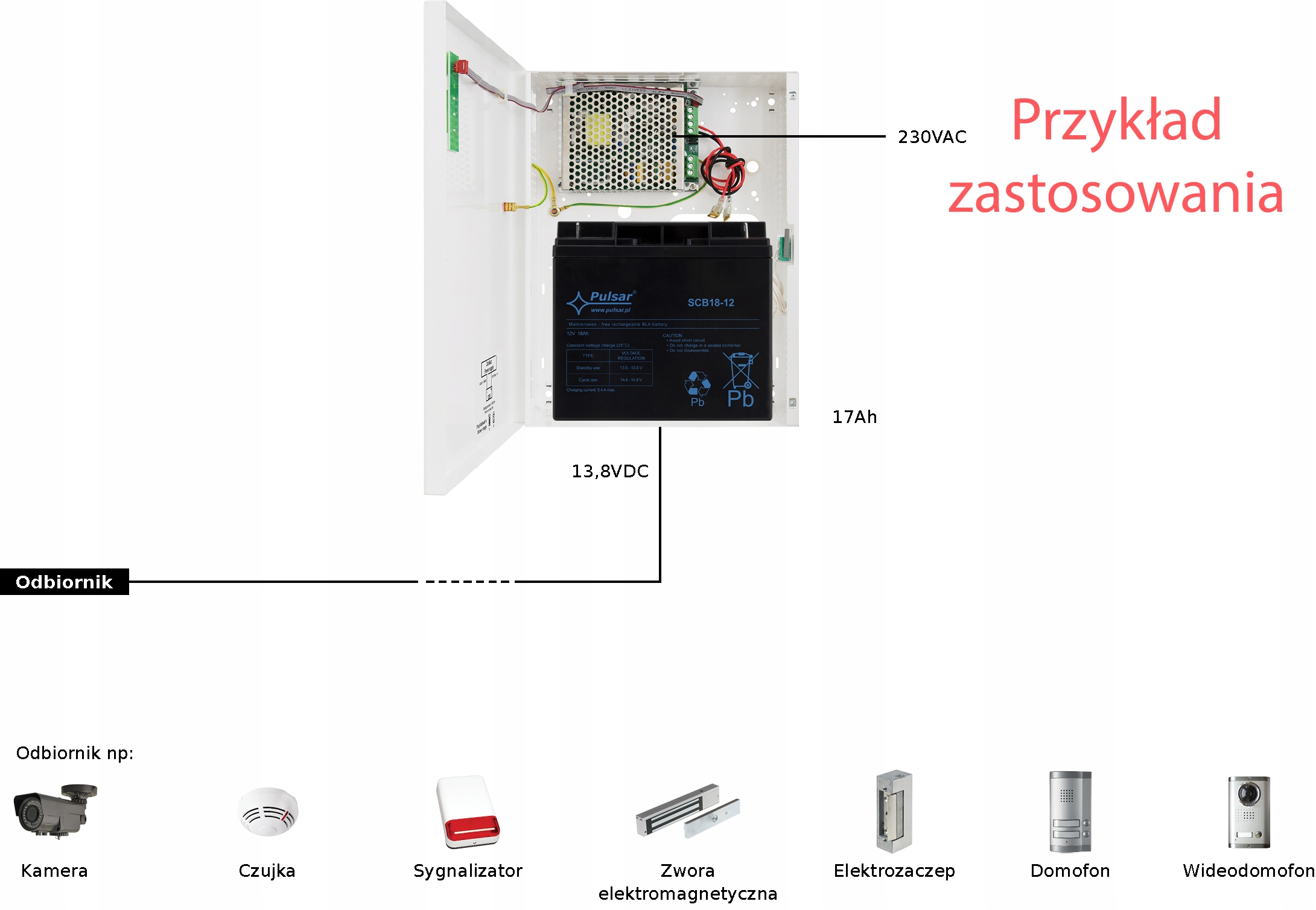 В случае пропадания сетевого напряжения устройство немедленно переключается на питание от аккумулятора. Блок питания выполнен на основе импульсного модуля питания, обладает высокой энергоэффективностью и помещен в металлический корпус (цвет RAL 9003) с местом для аккумулятора 18Ач/12В. Корпус оснащен микровыключателем, сигнализирующим об открытии дверцы (спереди).