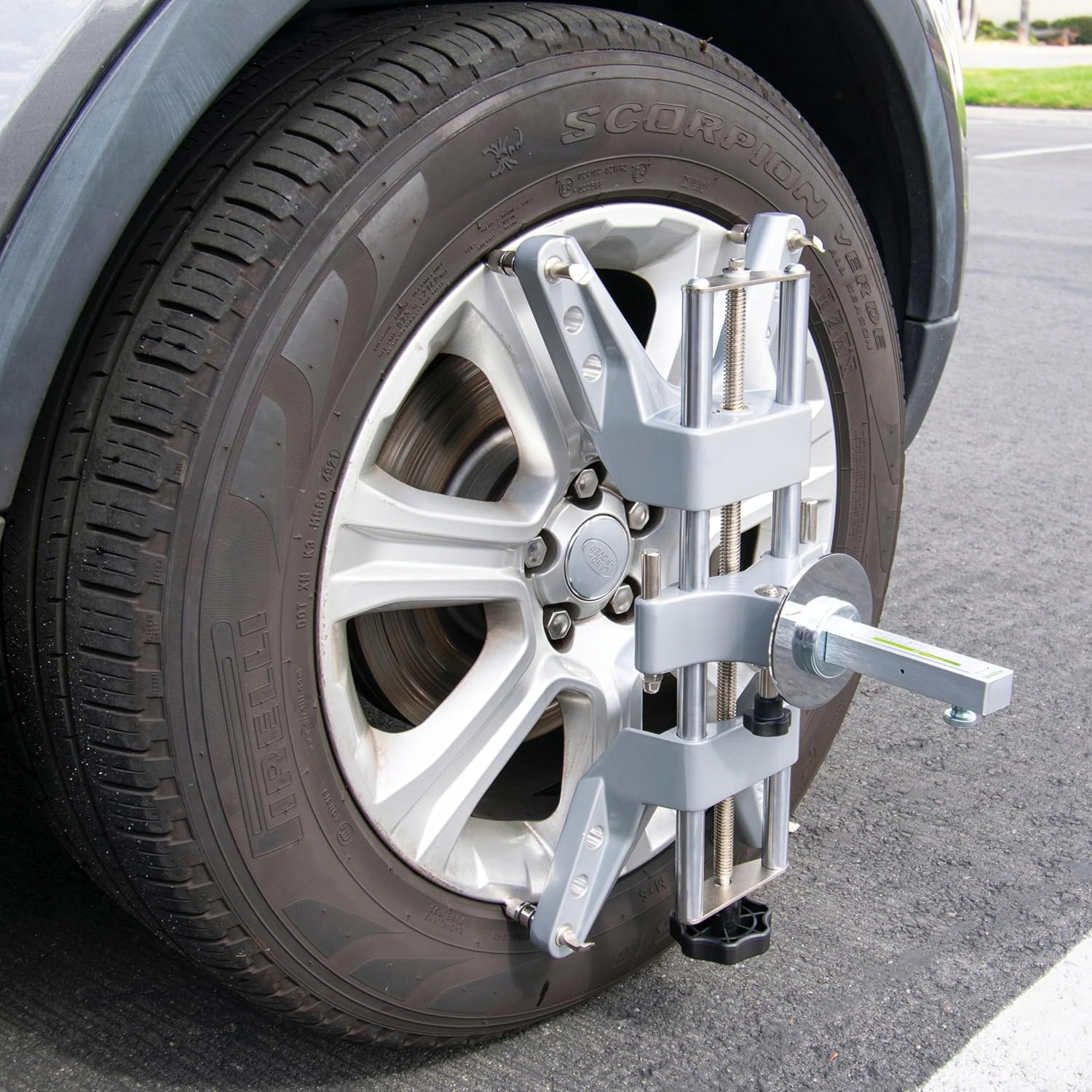 НЕОБХОДИМЫЙ ИНСТРУМЕНТ ДЛЯ ВЫРАВНИВАНИЯ Этот высококачественный зажим для колес надежно удерживает диски диаметром от 11 до 25 дюймов, что делает его незаменимым для точной регулировки центровки.