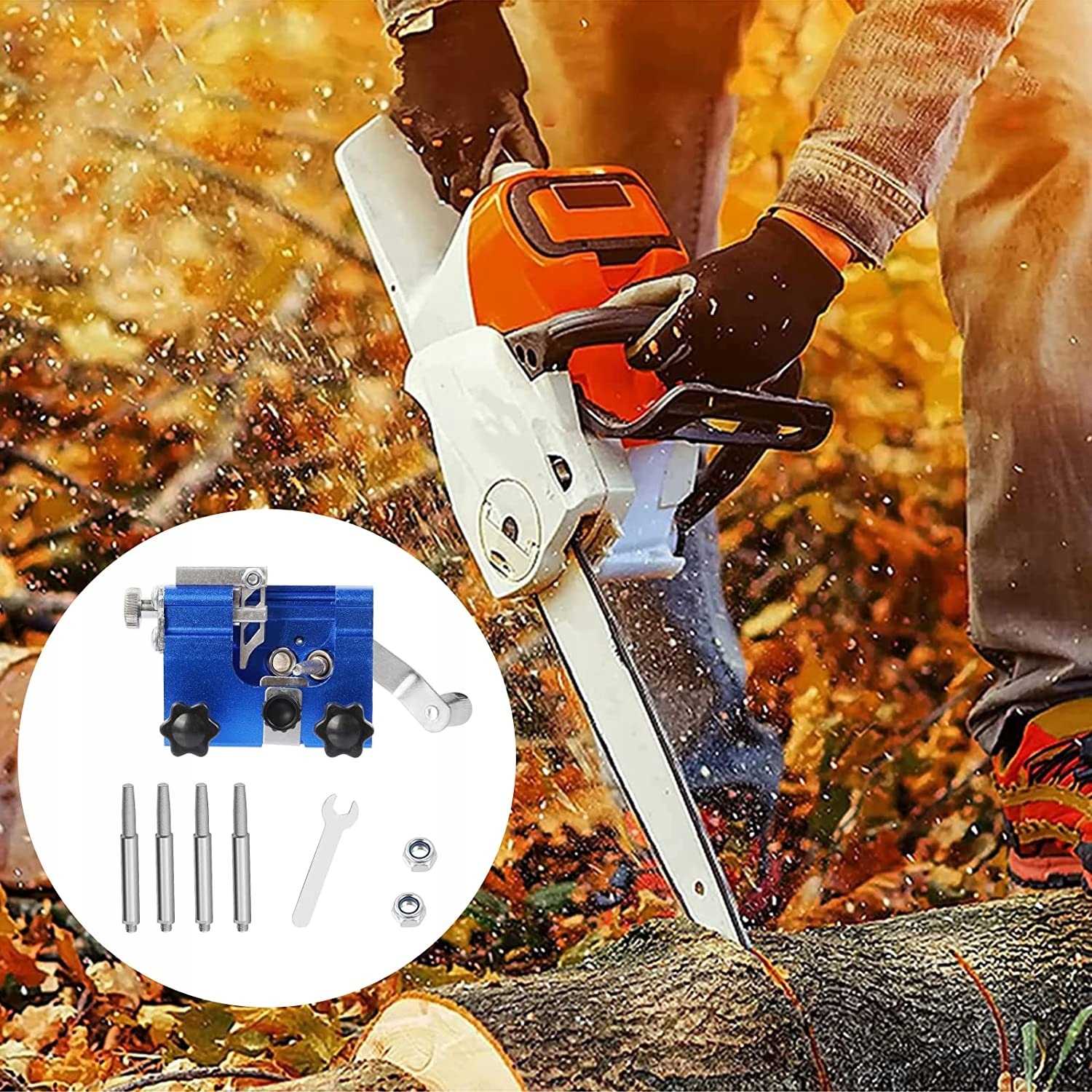 Точилка крепится к цепи с помощью регулируемых винтов. Эта точилка для бензопил подходит для большинства бензопил диаметром 8–20 дюймов, доступных на рынке.