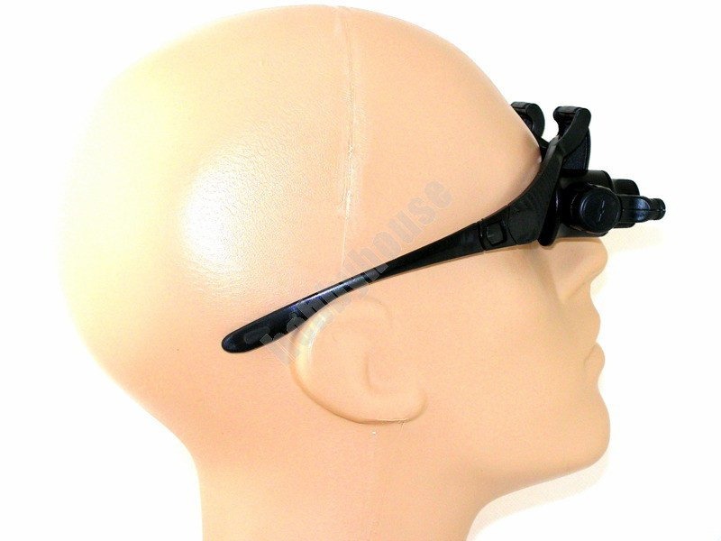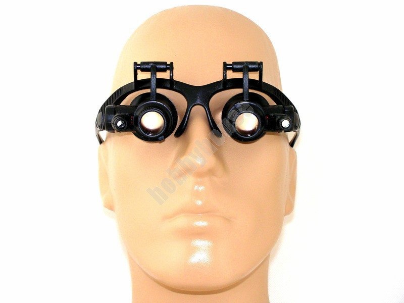 Очки, к которым крепятся линзы, крепятся на подвижных шарнирах, которые позволяют самостоятельно регулировать угол их наклона вверх -скважины. Угол наклона лампы относительно линзы также регулируется, что позволяет обеспечить точное освещение рабочего объекта.