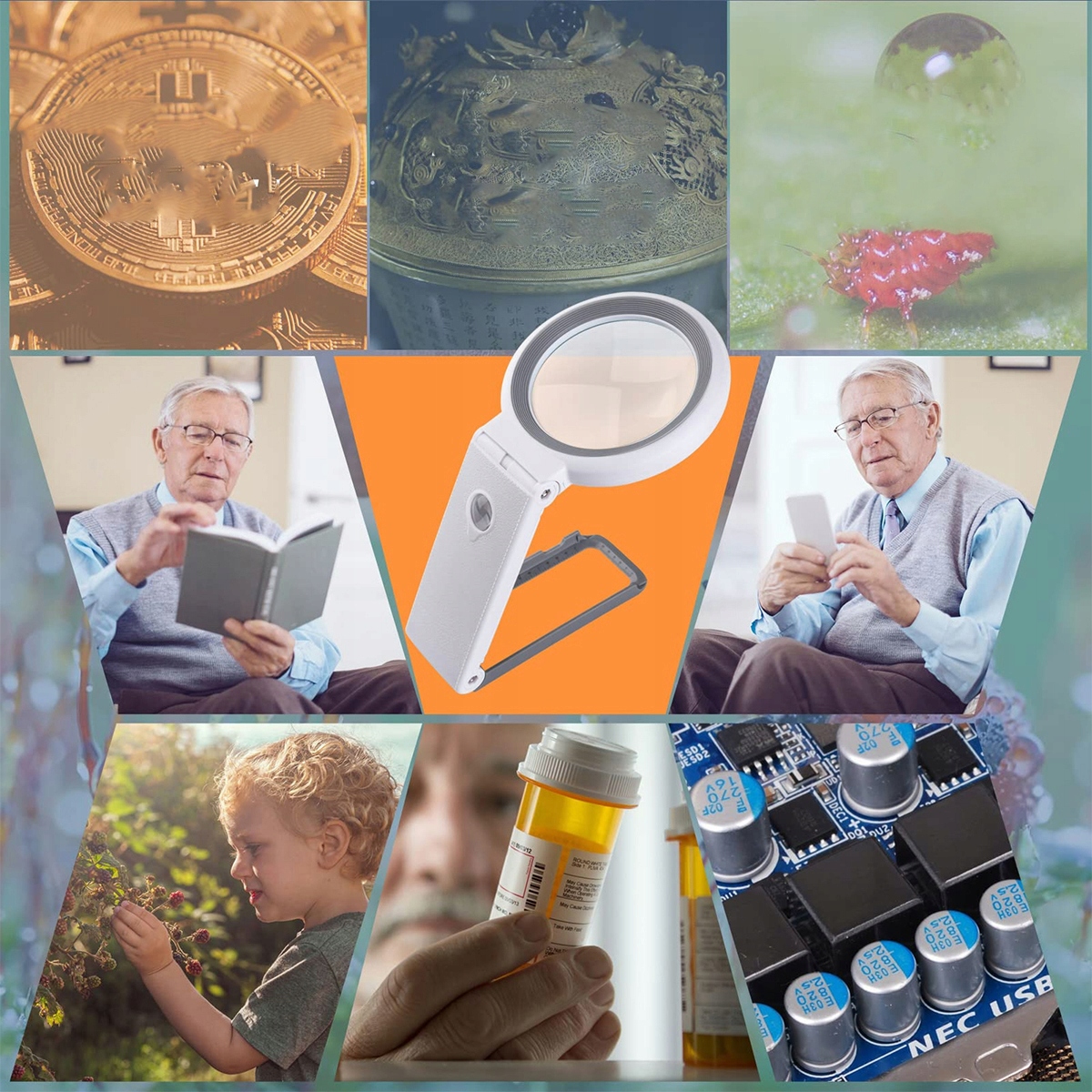 ⭐Складная подставка: ручка лупы складная, что позволяет разместить ее на столе и освободить руки для более удобного чтения. Вы также можете отрегулировать угол наклона в соответствии с вашими потребностями. База оснащена шкалой, позволяющей измерять мелкие предметы и делать простые чертежи (точность 0,5 мм и 1/16 дюйма).