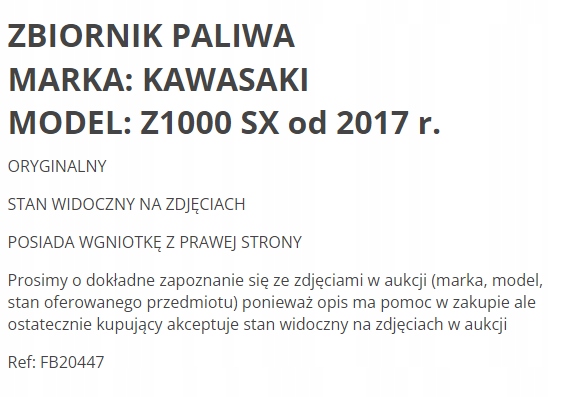 Просматривая «ZBIORNIK PALIWA KAWASAKI Z1000 Z 1000 SX 14+», вы можете быть уверены, что данный товар из каталога «[rubrica_name]» будет доставлен из Польши и проверен на целостность. В цене товара, указанной на сайте, учтена доставка из Польши. Внимание!!! Товары для Евросоюза, согласно законодательству стран Евросоюза, могут отличаться упаковкой или наполнением.