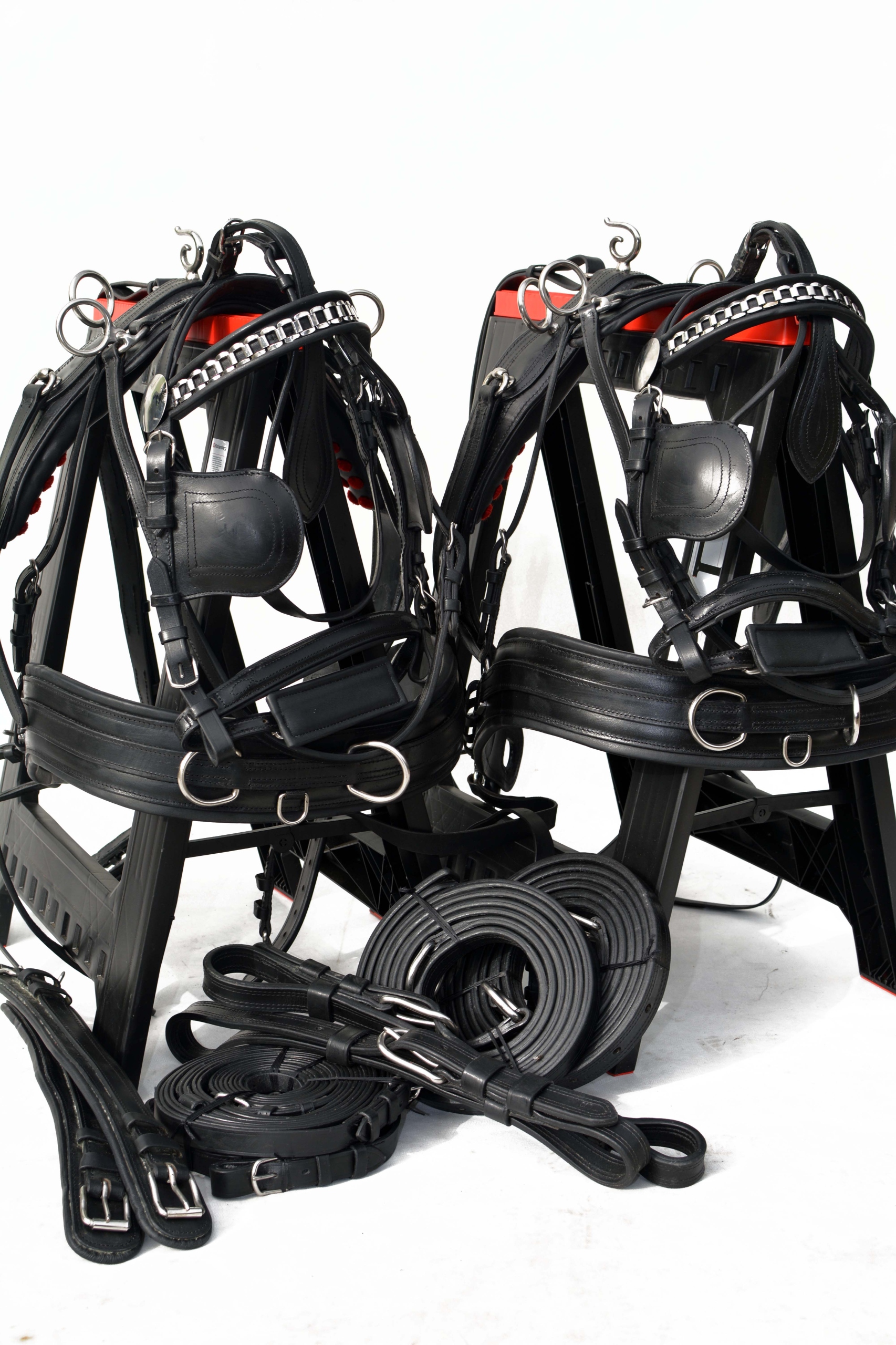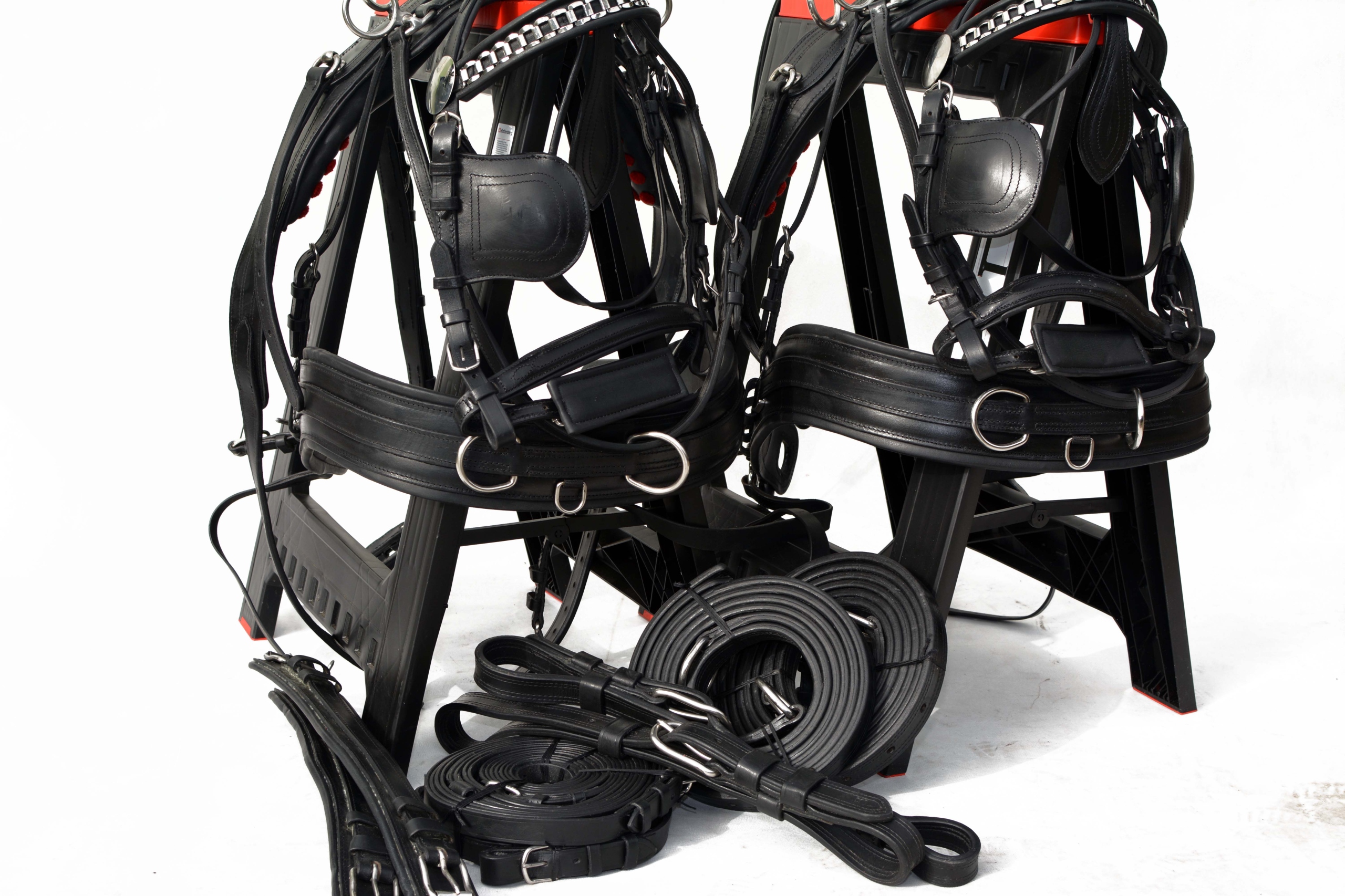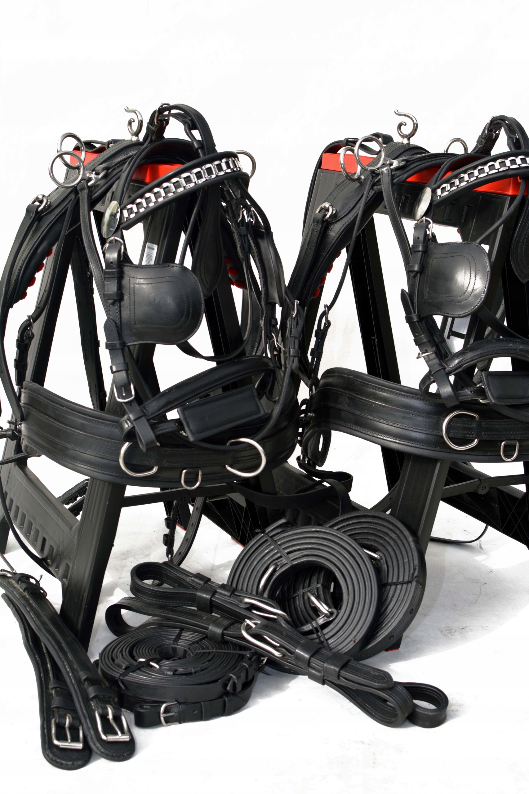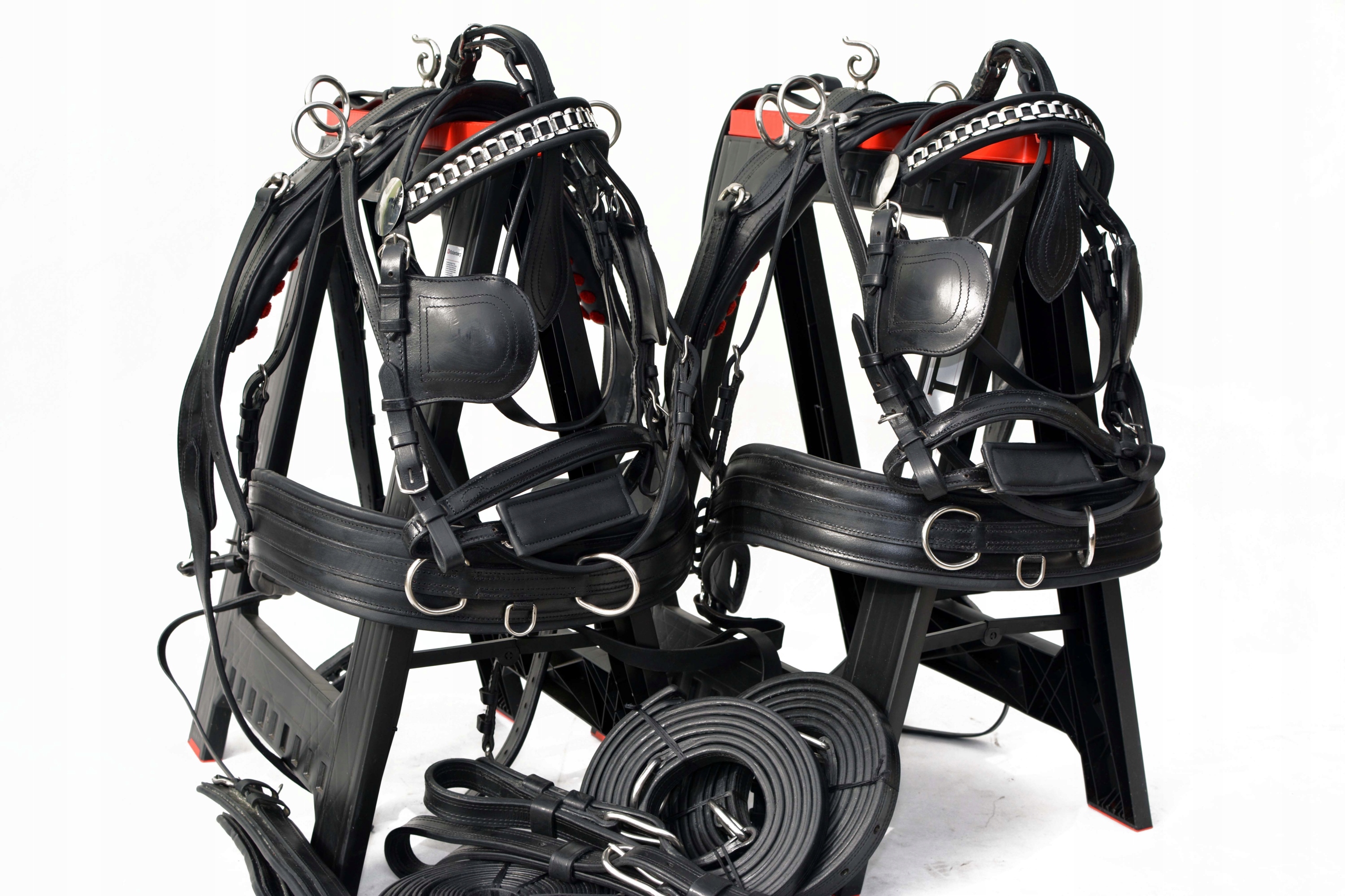 Упряжь для пары лошадей, размер COB. Шлейка полностью изготовлена из очень хорошей, отборной натуральной кожи, очень мягкой и приятной на ощупь, с вшитыми тесьмами во всех элементах шлейки для укрепления кожи. Профилированные груди оснащены нагрудниками, анатомически профилированными подпругами, анатомическими уздечками. затылочная часть и мягкая капсюля из нержавеющей стали, единственная подвеска такого типа на рынке.