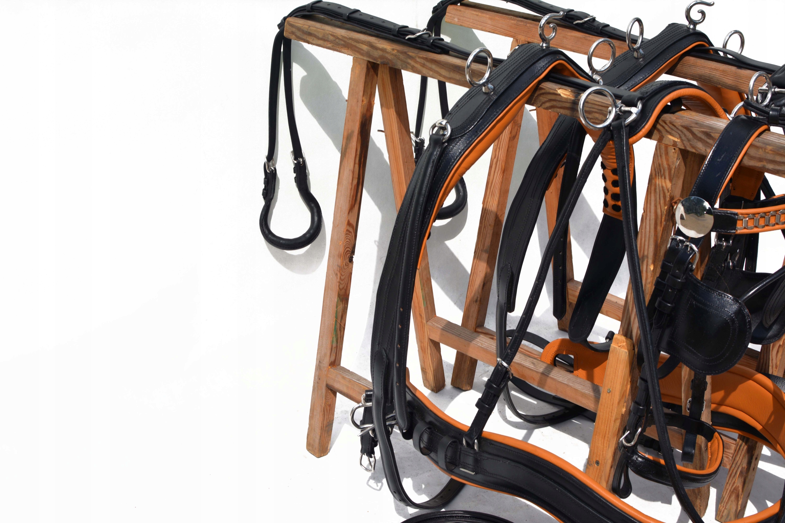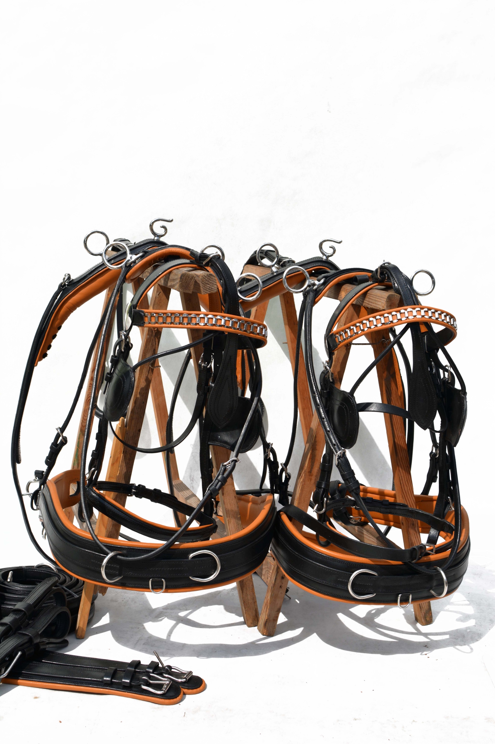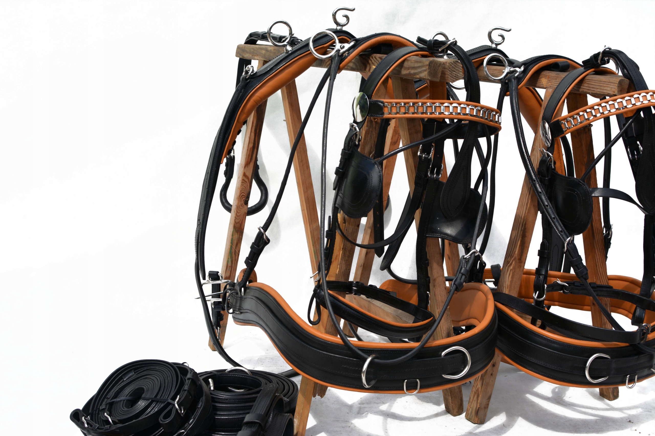 Упряжь для пары лошадей MARATON размер X-FULL Обычно изготавливается для хладнокровных лошадей. Шлейка полностью изготовлена из очень хорошей, отборной натуральной кожи, очень мягкой и приятной на ощупь, с вшитыми лентами во всех элементах шлейки для укрепления кожи. Профилированные груди оснащены нагрудниками, анатомически профилированными подпругами, анатомическими уздечками. затылочная часть и мягкий капсюль из нержавеющей стали, единственная подвеска такого типа на рынке, сделана отлично.