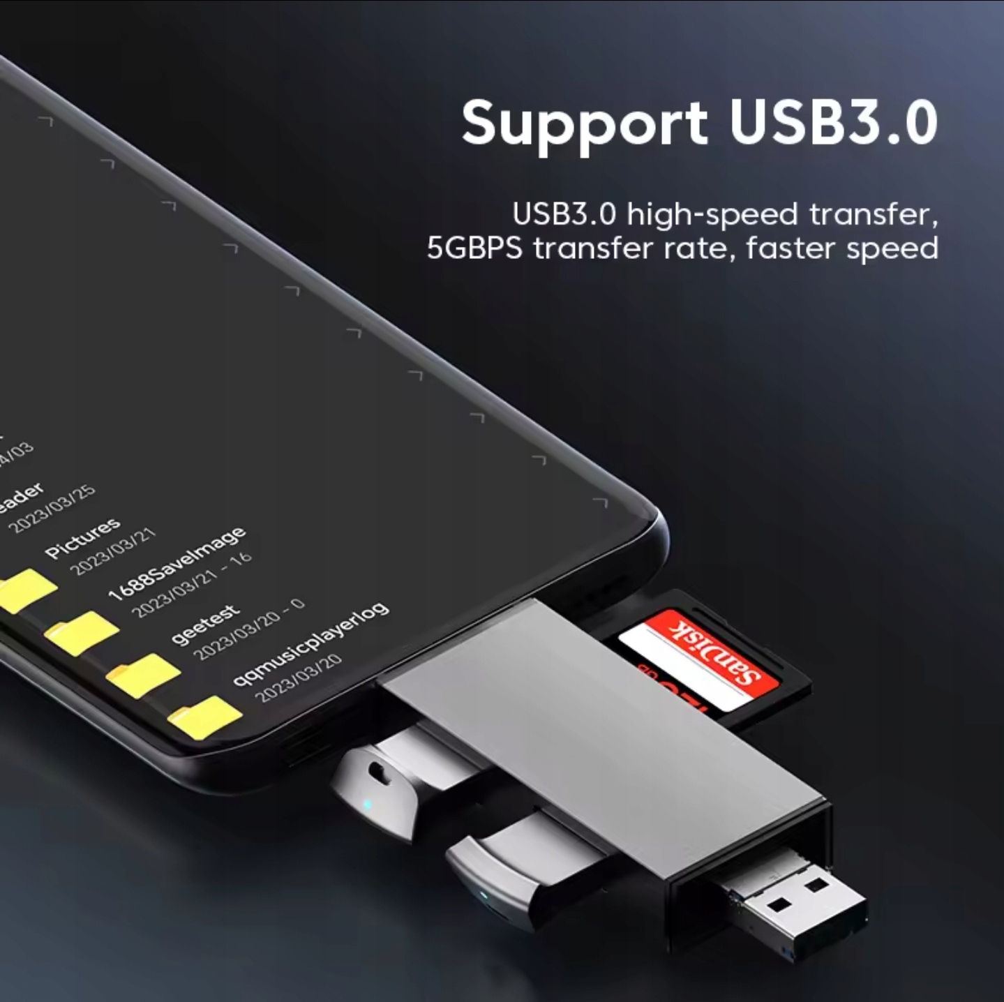 Читатель карты памяти 7 в 1 серого цвета с USB 3.0.2.0, USB-тип C, USB-типа Micro и SD и TF розетки, оснащенные горячим FIR, что позволяет использовать разъем бифукции, что очень удобно. Данные на скорости 5 Гбит/с, удобство подключения типа и воспроизведения