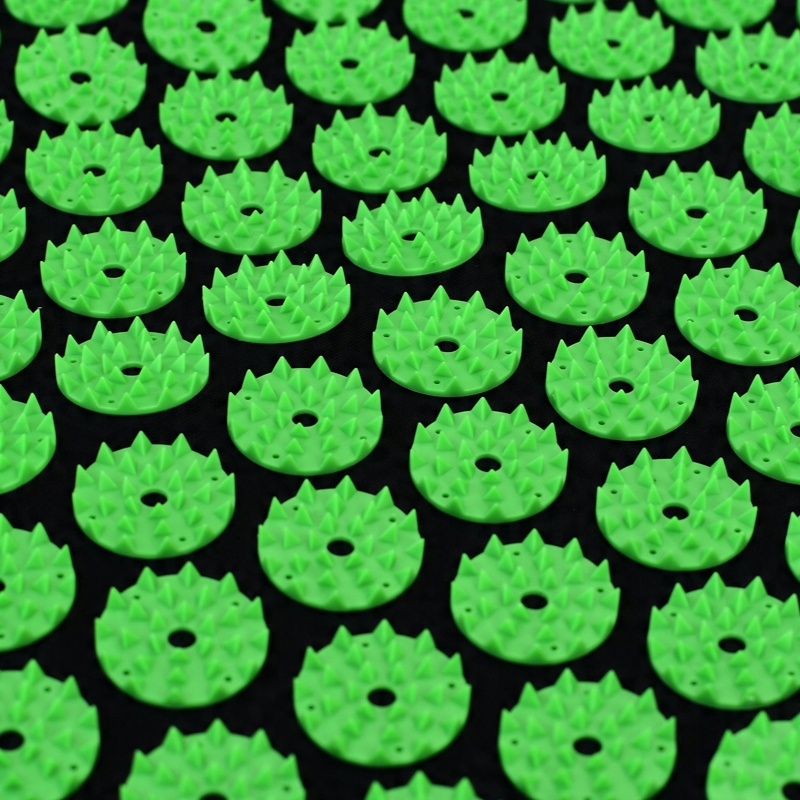 Коврик оснащен шипами, которые, нажимая на определенные участки тела, способствуют лучшему кровоснабжению мышц, улучшают их гибкость, стимулируют выброс эндорфинов.