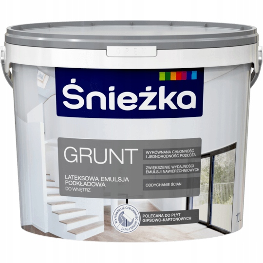 Śnieżka GRUNT – это суспензия пигментов и наполнителей в водной дисперсии латексной смолы с добавлением вспомогательных и осветляющих веществ. Благодаря специальным добавкам наносится толстым слоем и нивелирует различия в текстуре и цвете основания. Проникает в основание, улучшая адгезию финишного слоя и снижая его расход. Использование Śnieżka GRUNT существенно снижает затраты на покраску, ведь для достижения ожидаемого эффекта обычно достаточно одного слоя грунтовки и одного финишного покрытия. Особенно рекомендуется для первой окраски гипсокартона и поверхностей с неоднородной текстурой. Прекрасно покрывает цемент, цементно-известковые растворы, древесину и древесные материалы в жилых, общественных и промышленных помещениях. Предназначен для окраски внутри помещений.