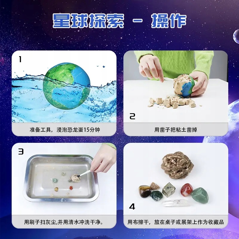 Это игрушка, сделанная своими руками, имитирующая археологические раскопки, с уникальной и привлекательной концепцией. Позвольте детям использовать инструменты для раскопок, чтобы выкопать модули продукта, и благодаря постепенному представлению окаменелостей, алмазов, драгоценных камней и керамических изделий это принесет детям радость, чувство выполненного долга и желание копать глубже, чтобы испытать археологические раскопки и исследования. Веселье, которое оно приносит, способствует развитию у детей любознательности, практических навыков и терпения и в то же время обогащает знания в области археологии. Это типичная забавная игрушка и замечательная поделка.
