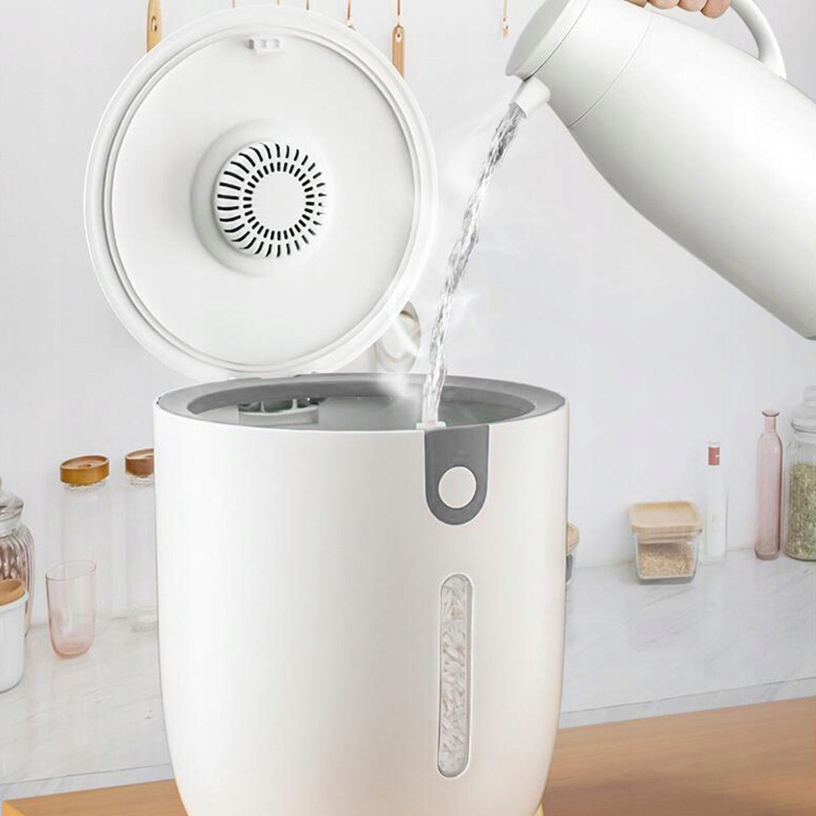 емкость: 10 литров, прозрачное видимое внутреннее окно может быть проверено в любое время, удобное для получения риса, позволяет иметь оставшуюся сумму. Деревянные ноги более стабильны