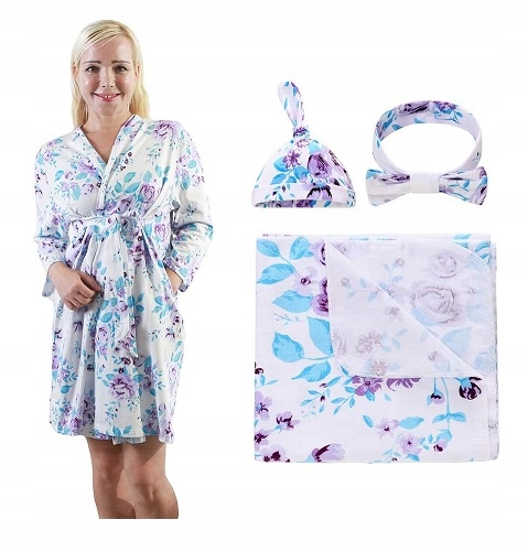 ZESTAW CIĄŻOWY DLA MAMY I DZIECKA SZLAFROK KOCYK CZAPKA OPASKA ROZ.S