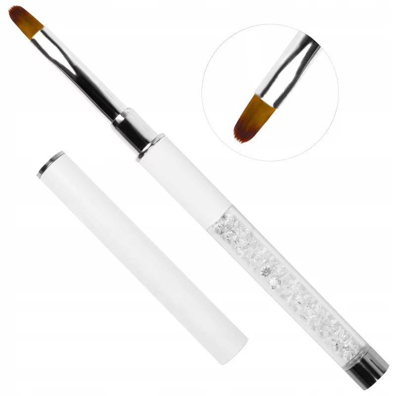 Кисть имеет закругленный кончик, который достигает всех уголков ногтя, а ее контурная ручка идеально лежит в руке.