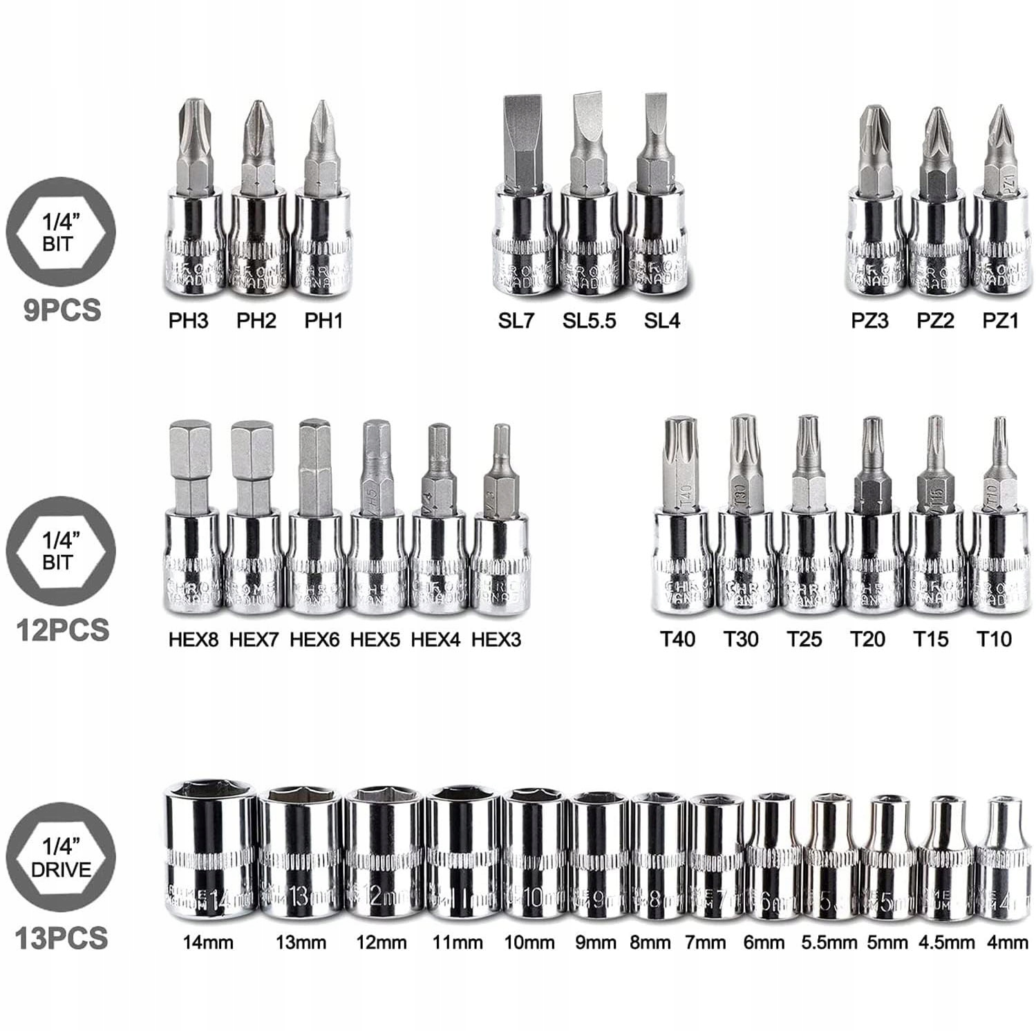 - 13 шт. Головки 1/4 дюйма: 4; 4,5; 5; 5,5; 6; 7; 8; 9; 10; 11; 12; 13; 14 мм