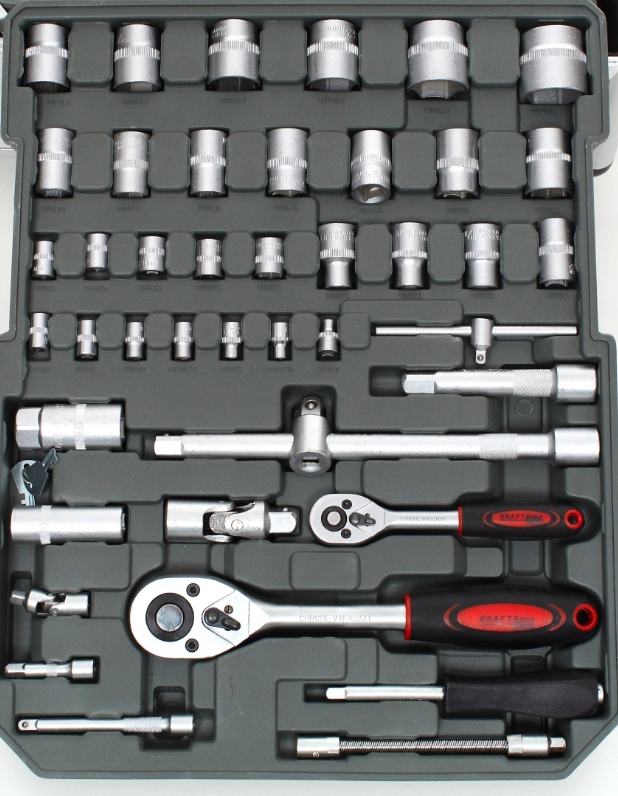 В набор входят: рожковые ключи, торцевые ключи, трещотка, молоток, набор плоскогубцев, уровень, струбцины, рулетка, изоляционная лента, нож, набор гвоздей и шурупов, а также отвертки и насадки-биты.