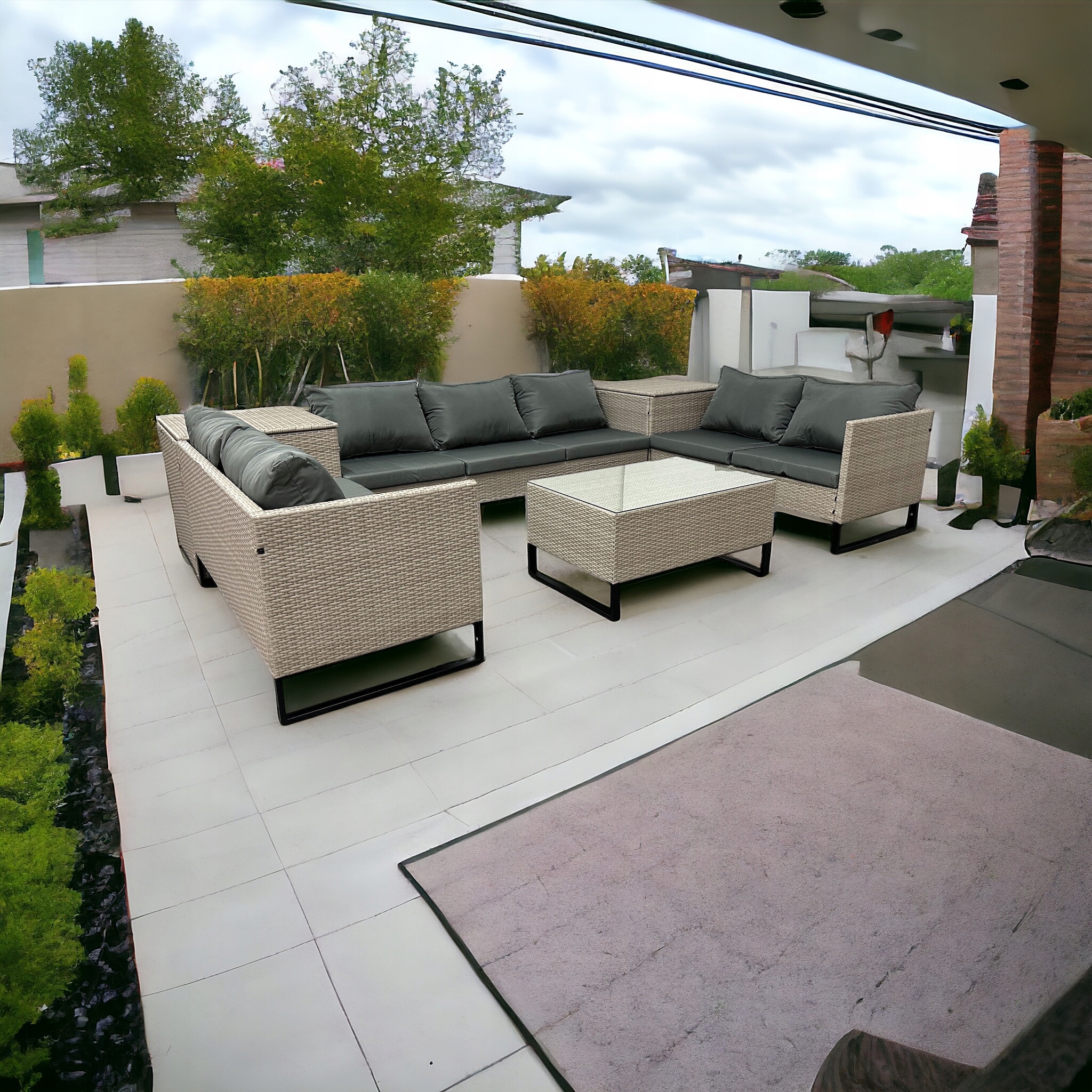 П-образный садовый угловой диван из техноротанга обеспечивает не только комфорт, но и чувственность благодаря элегантному дизайну и мягким, просторным подушкам. . Это место, где можно с комфортом погрузиться в атмосферу и насладиться окружающей обстановкой, в окружении приятных материалов и приятного для глаз внешнего вида.