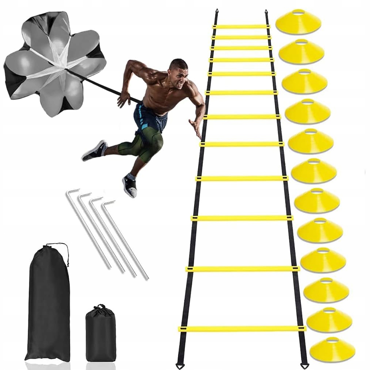 - В каждый комплект входит лестница для ловкости. длиной 6 м, 12 перекладин, 12 футбольных конусов, 1 парашют сопротивления, 4 стальные колья для дополнительной устойчивости и 2 сумки для переноски.