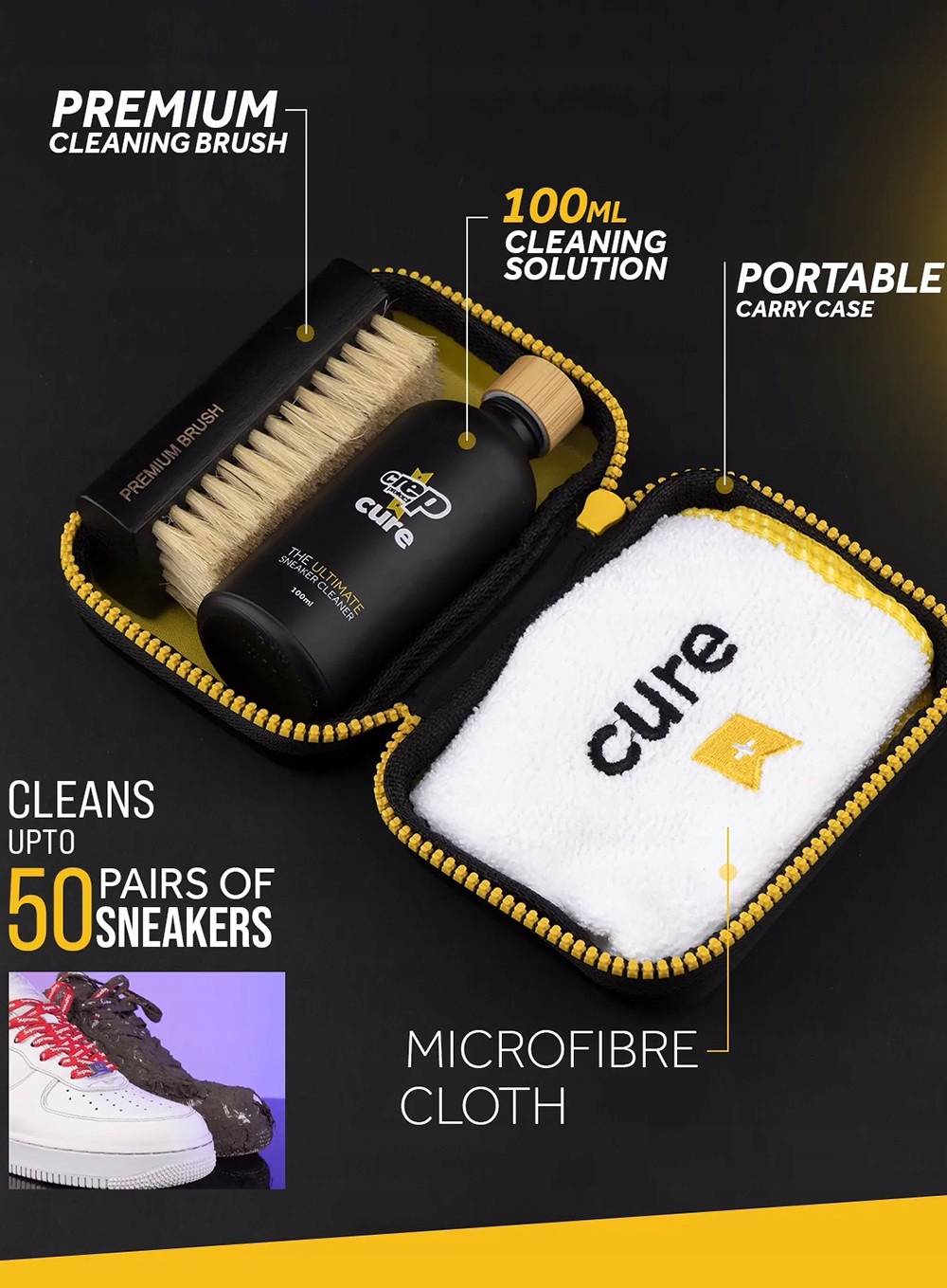 - Комплексный уход за кроссовками: 100 мл натурального раствора, высококачественной щетки, ткани и чехла.
