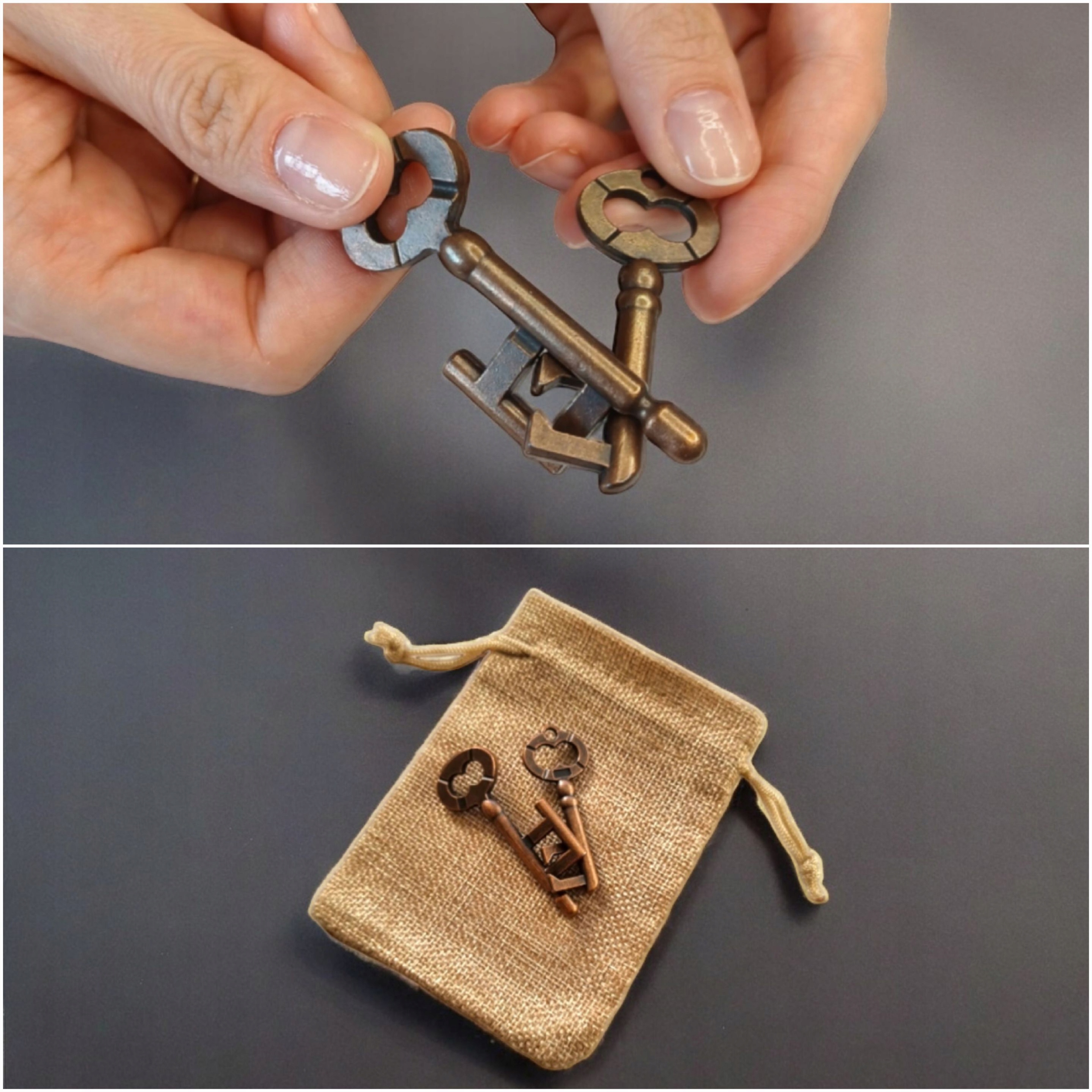 Ключи. Задача этой головоломки — найти способ разделить два связанных ключа. Клавиши были тщательно изготовлены с вниманием к деталям, что придает им элегантный и уникальный вид.