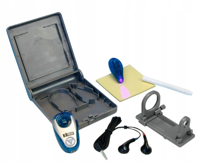Состав: очки ночного видения, съемный отражатель, ручка для секретных сообщений, мини-подсветка, мини-подслушивающее устройство, сигнализация движения, складная телескопическая труба и лупа.