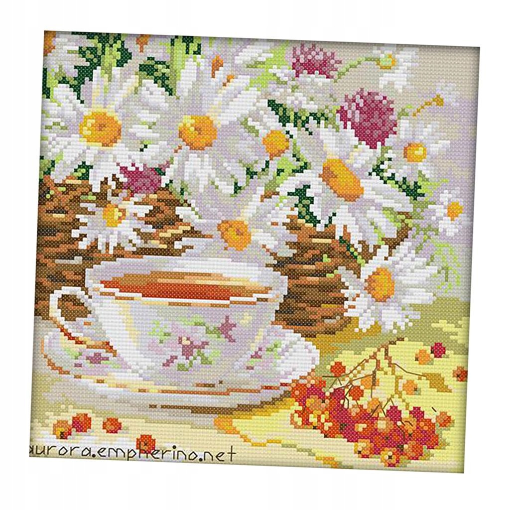 Предварительно напечатанный рисунок цветов и чая делает вышивку простой и удобной.
