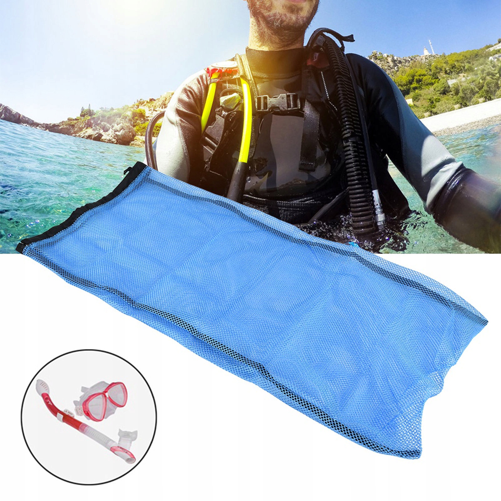 Сетчатая сумка для упаковки маски и ласт для плавания, дайвинга, сумка на шнурке для водных видов спорта, подводного плавания, синяя