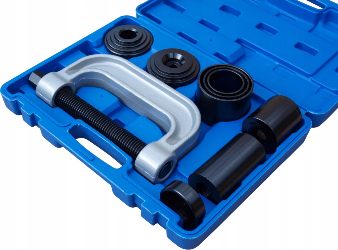 Комплект предназначен для монтажа и демонтажа подшипников в поворотных кулаках и втулках подвески. В комплект входит винтовой пресс и адаптеры. Все в элегантном чемодане.