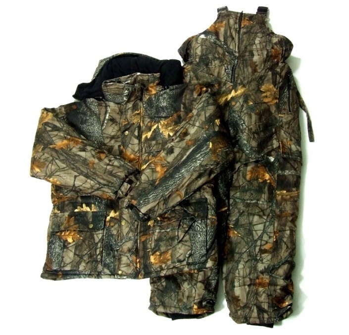 Зимний набор - куртка и брюки на брекетах. Камуфляж, как на картинке - листья. Это очень светло и тепло. Он будет эффективно защищать от большого мороза, даже при - 30 c> c. Вес набора 2,8 мг.