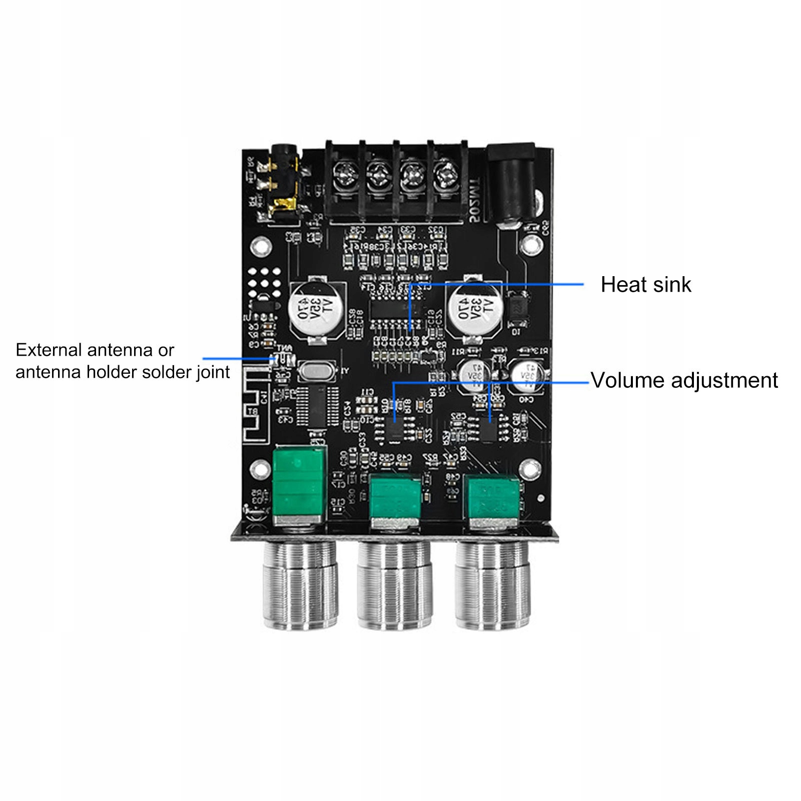 2. Регулировка высоких и низких частот: наш модуль поддерживает независимую регулировку высоких и низких частот, аудиовход Bluetooth и AUX и мощность 50 Вт для левого и правого каналов.