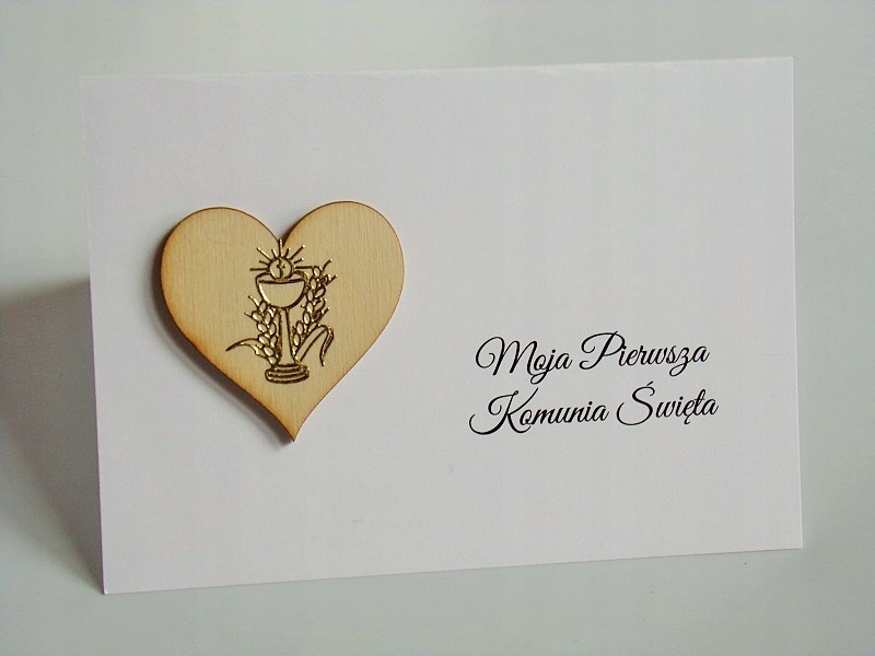 Очаровательное, нежное приглашение к Первому Причастию с сердечком и золотой чашей.