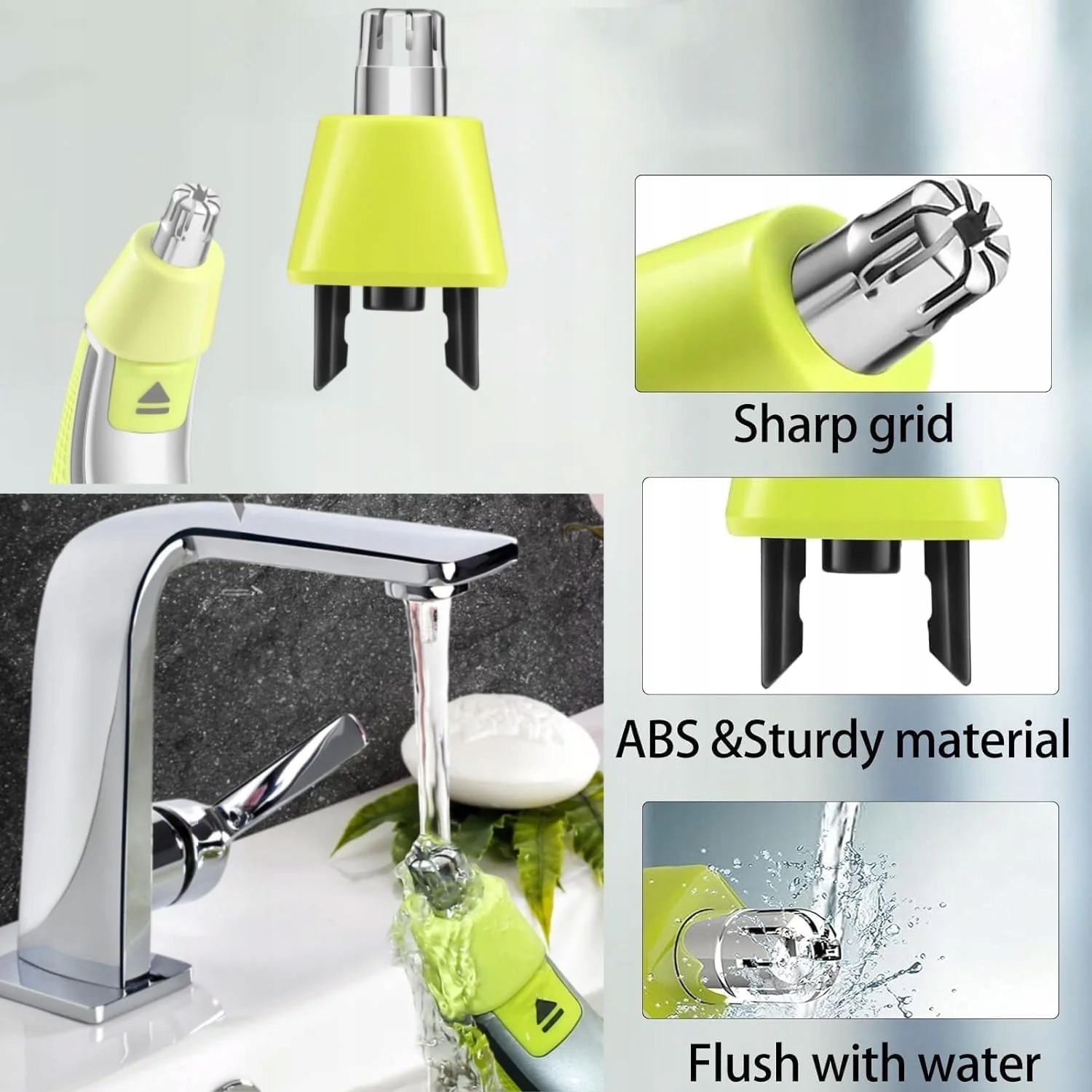 Заменяемая носовая лезвия изготовлена из ABS -пластика и высококачественной нержавеющей стали, оно устойчиво к грязи, их можно промыть непосредственно под краном или очищены путем замачивания, его можно использовать как влажную, так и сухой, так что вы можете равномерно и эффективно побрить.