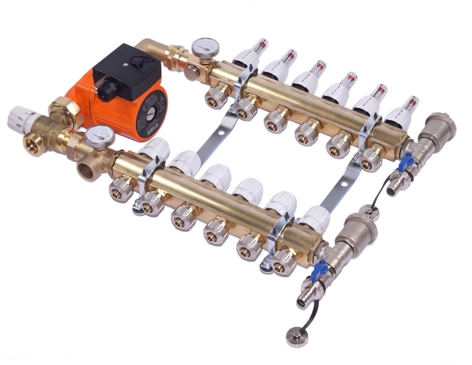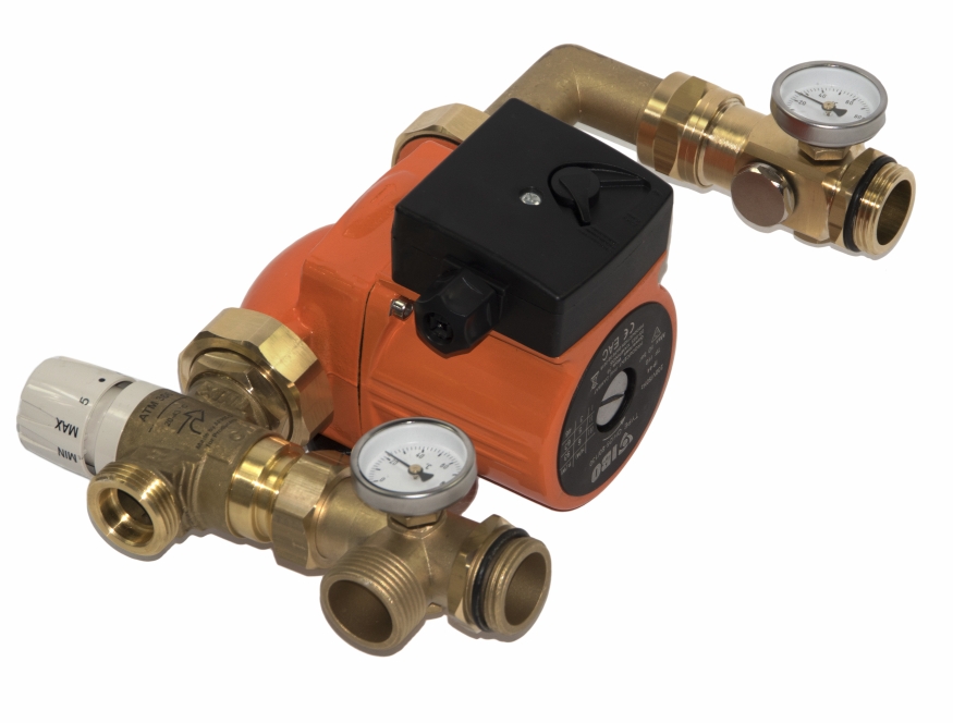 Насосно-смесительный агрегат применяется в системах теплого пола в смешанной системе, т.е. когда низкотемпературный теплый пол и высокотемпературная радиаторная установка работают в одной отопительной установке. Комплект снижает и поддерживает температуру среды, питающей систему теплого пола, сохраняя при этом максимальную энергоэффективность.