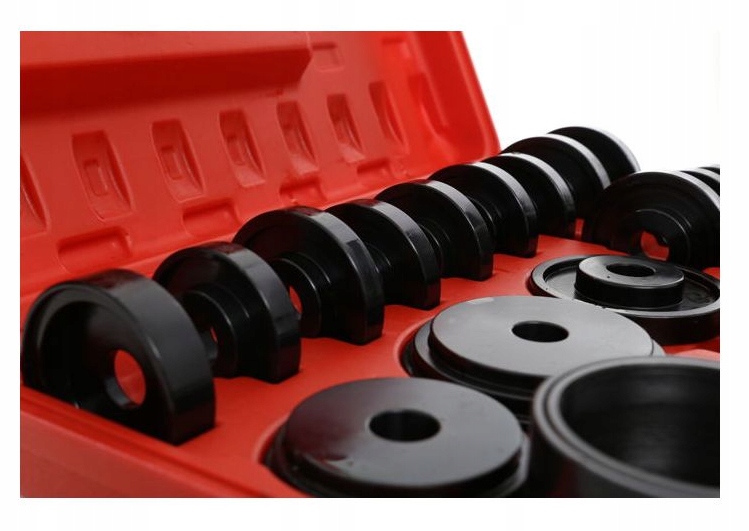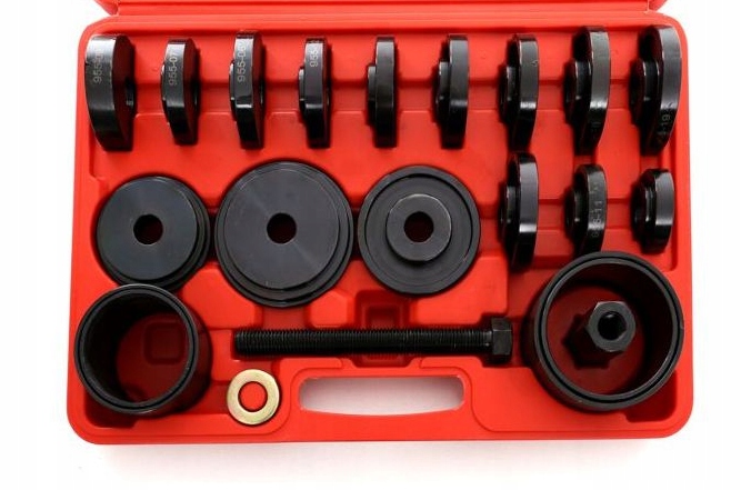 Набор для установки и снятия резинометаллических подшипников, для крепления передней ступицы легковых автомобилей. Используется в автосервисах, диагностических заводах, механиках и т.п., подходит для монтажа и демонтажа крупных промышленных подшипников. Комплексный набор инструментов для быстрого и эффективного снятия и установки подшипников на переднеприводных автомобилях. Снижает риск повреждения ступицы колеса и подшипников.