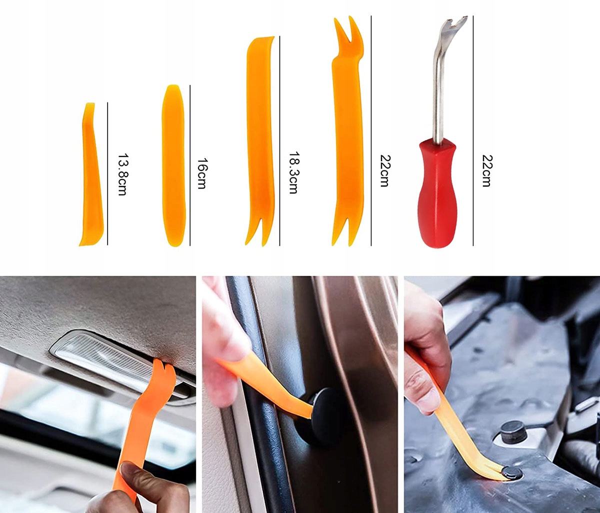 Специализированный набор для демонтажа обивки и молдингов автомобиля чрезвычайно удобен в использовании и в то же время устойчив к повреждениям. Благодаря этому вы снижаете риск повреждения и царапин обивки и окрашенных элементов. Идеально подходит для повседневных задач, связанных с разборкой небольших устройств. Поэтому, если вы планируете снять обивку автомобиля и хотите сделать это неинвазивно, обязательно купите набор средств для снятия обивки.